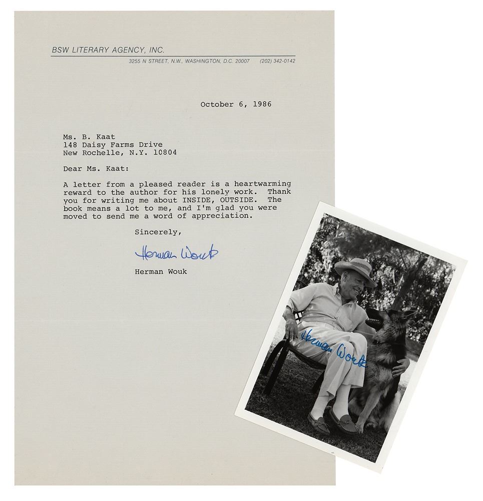 Two items: a glossy 3.25 x 4.75 photo of Herman Wouk seated outside with his German Shepherd, signed in blue ink; and a TLS, one page, 6.75 x 10, BSW Literary Agency letterhead, October 6, 1986, in full: "A letter from a pleased reader is a heartwarming reward to the author for his lonely work. Thank you for writing me about INSIDE, OUTSIDE. The book means a lot to me, and I’m glad you were moved to send me a word of appreciation." In overall very fine condition. Accompanied by the original mailing envelope.
