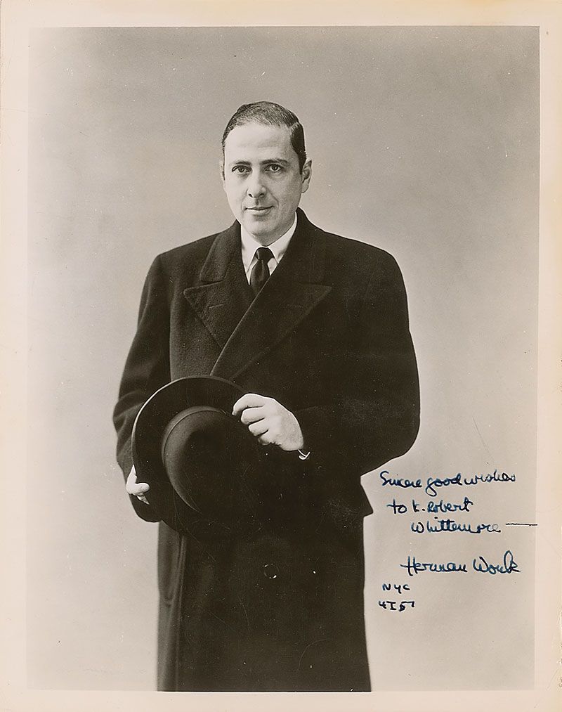 Vintage glossy 8 x 10 portrait of Wouk in a long coat, signed and inscribed in fountain pen, “Sincere good wishes to K. Robert Whittemore—Herman Wouk, NYC, 4-I-57.” In very good condition, with scattered surface bends and creases, a few cracks to the emul