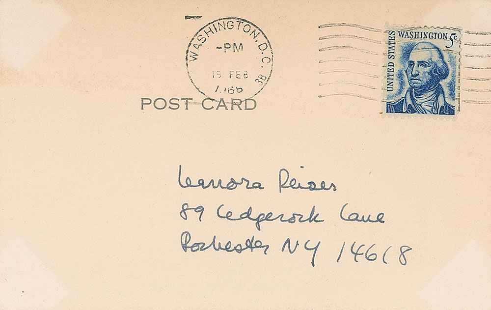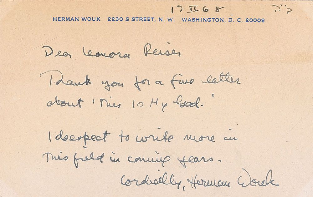ALS, one page, 5.5 x 3.5, personal letterhead postcard, February 17, 1968. Letter to an admirer. In full: “Thank you for a fine letter about ‘This is My God.’ I do expect to write more in this field in coming years.” Reverse is also addressed in Wouk’s hand. In fine condition, with light scattered toning.