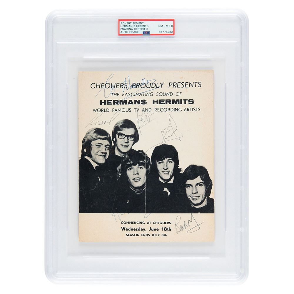 Vintage 6.5 x 8 handbill for a residency of Herman& #39;s Hermits at Chequers Nightclub in Sydney, Australia, signed and inscribed in blue ballpoint by Peter Noone, & ldquo;To Darnelle, Herman,& rdquo; and signed in black ballpoint by his bandmates, & ldquo;Karl,& rdquo; & ldquo;Keith,& rdquo; & ldquo;Barry,& rdquo; and & ldquo;Lek.& rdquo; In fine condition. Encapsulated and graded by PSA/DNA as "NM-MT 8."