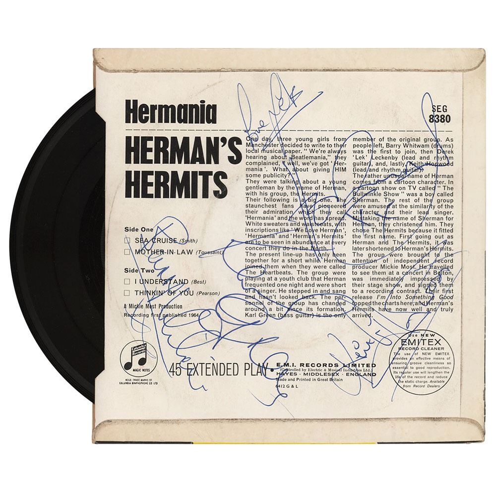 Hermania 45 RPM EP record released by Columbia/EMI in 1964, signed on the back of the sleeve in blue ballpoint by Peter Noone, Barry Whitwam, Karl Green, Derek Leckenby, and Keith Hopwood. In fine condition, with some light scuffing. The record is included.