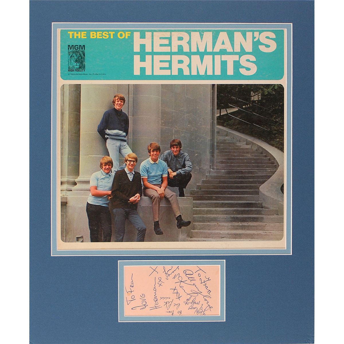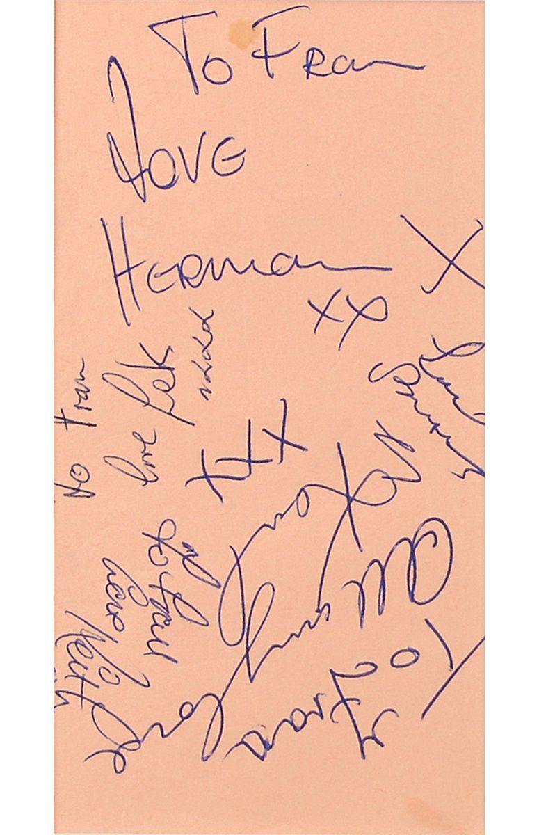 Vintage ballpoint signatures and inscriptions of Noone, signing “Herman,” Karl, Barry, Keith, and Lek on a light pink album page. Double matted with an album cover for The Best of Herman’s Hermits to an overall size of 15 x 18. In fine condition.