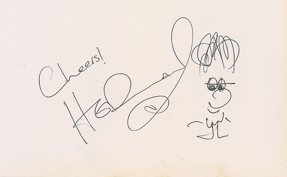 Original vintage ballpoint sketch of a hermit by Peter Noone on an off-white 9 x 5.75 sheet, signed, “Cheers! Herman.” In fine condition, with light toning and soiling to lower border.