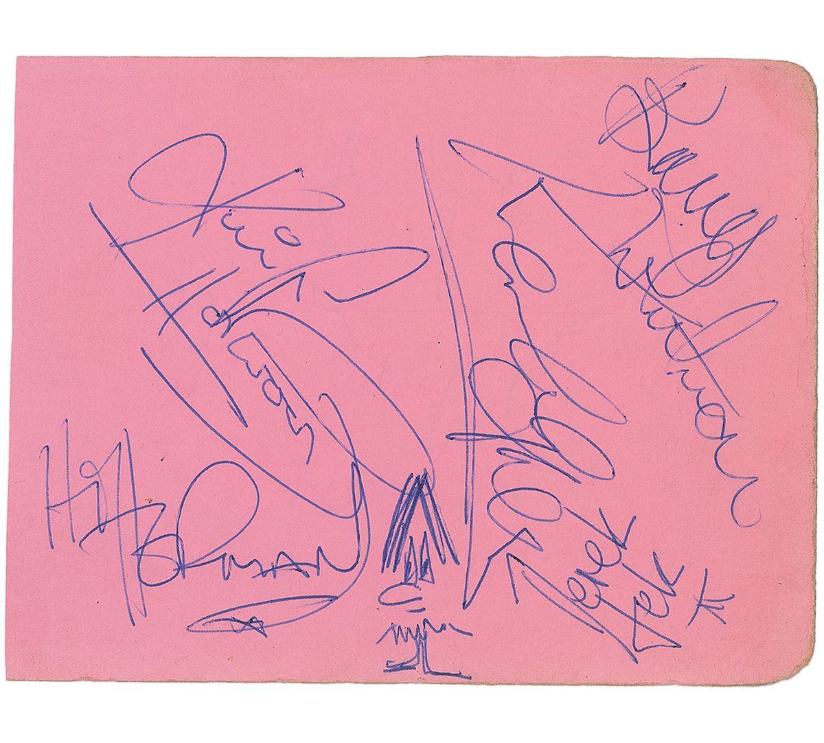 Vintage ballpoint signatures, “Hi Herman,” adding a small sketch next to his signature, “Barry Whitwam,” “Derek Lek,” “Keith Hopwood,” and “Karl Green,” on a pink 5.25 x 4 album page. In fine condition.