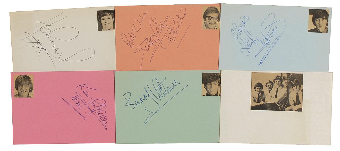Five items ballpoint signatures on individual 6 x 4 cards of Peter Noone (signed “Herman”), Derek Leckenby, Keith Hopwood, Karl Green, and Barry Whitwam. In overall fine condition, with a block of toning on Noone’s card and a small image affixed to each item.