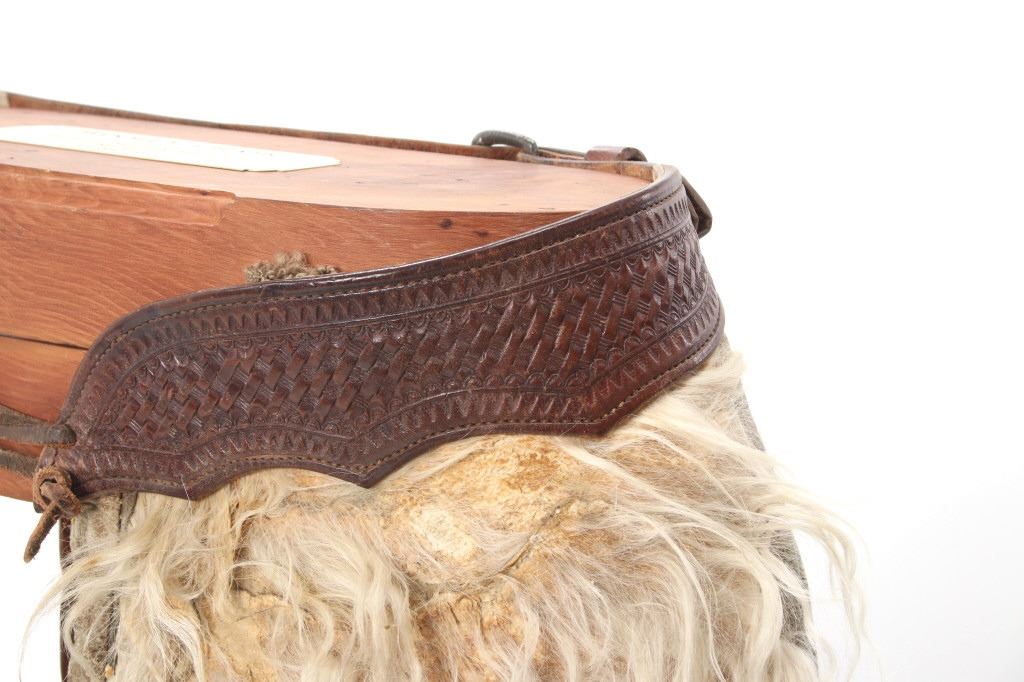 Featured in this lot is this Hermann Heiser Saddlery Co. angora wooly chaps circa 1880 - 1910. The chaps shows a wonderfully and professionally crafted leather and angora wool construction that shows with a basket woven tooled leather belt and shows soft angora wool construction. The stand is a shows a clear hardwood construction that shows a spiraling decoration and that shows wonderful craftsmanship and a plaque that reads as follows: "Wooly Chaps - Mfd by - Hermann Heiser Saddlery Co. - Denver Co. - ca 1880-1910." The condition of this pair of chaps is good with a slight wear to the belt sleeve and under the yoke but otherwise in good overall condition. The overall measurements of this pair of chaps is 38" x 16 1/2" x 7 1/2".