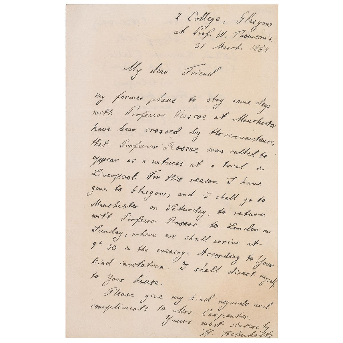 Versatile German scientist (1821–1894) known for his discoveries related to visual and aural perception, electrodynamics, and the conservation of energy. ALS signed “H. Helmholtz,” one page, 4.5 x 7, March 31, 1864. Letter to an unidentified friend. In part: “My former plans to stay some days with Professor Roscoe at Manchester have been crossed by the circumstance that Professor Roscoe was called to appear as a witness at a trial in Liverpool.” A few creases and wrinkles, some light toning to bottom, and pencil notations on reverse, otherwise fine condition.