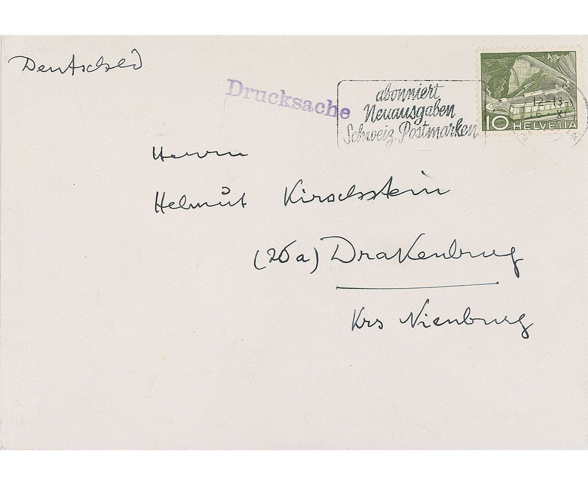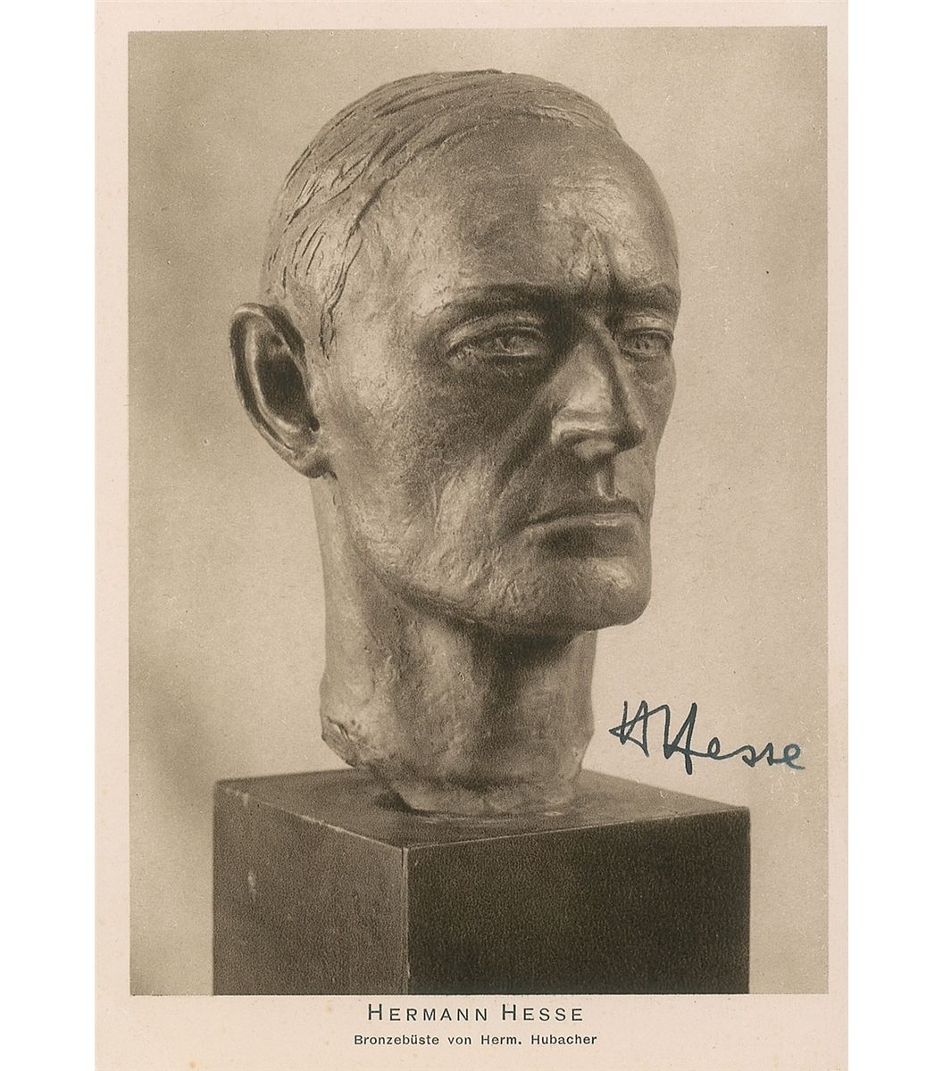 Superb 4 x 5.75 postcard photo of a bronze bust sculpture of Hesse, signed in fountain pen, “H. Hesse.” In fine condition. Accompanied by the original mailing envelope, addressed in Hesse’s hand.