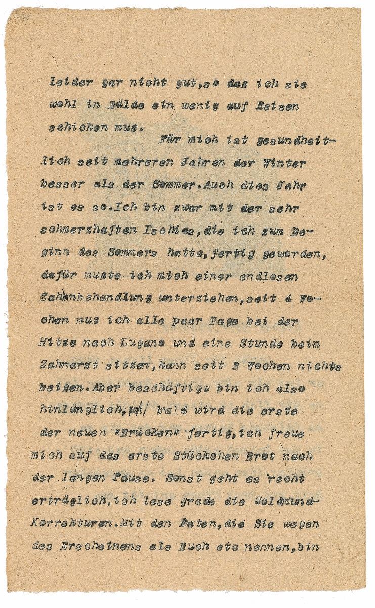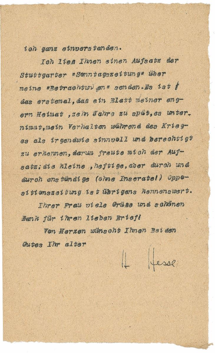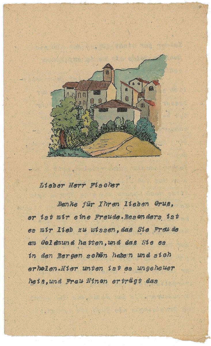 TLS signed “H. Hesse,” three pages on two adjoining sheets, 5.25 x 8.75, no date but circa 1930. Untranslated letter to his publisher Samuel Fischer featuring a gorgeous original watercolor painting of a mountaintop village. Hesse writes regarding his dental treatment in Lugano as well as sending an essay about his ‘Betrachtungen.’ In fine condition.