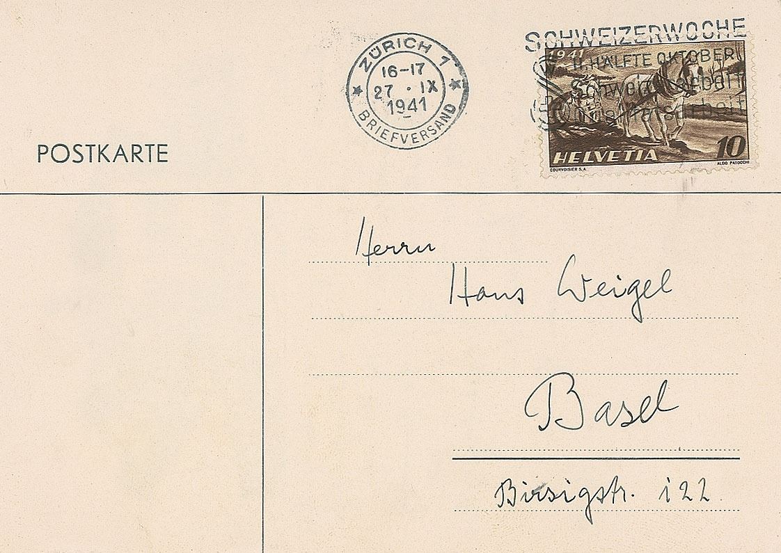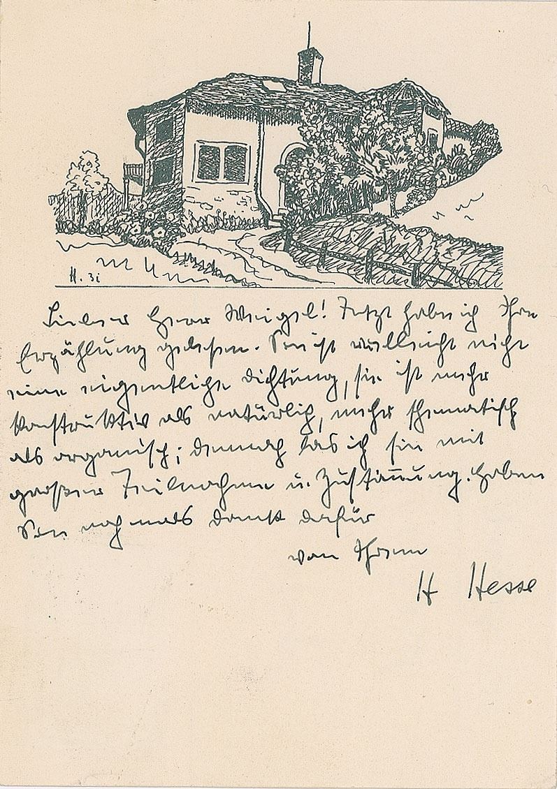 ALS in German, signed “H. Hesse,” one page, penned on the reverse of a 4 x 5.75 postal card with bucolic house engraving, September 27, 1941. An untranslated letter to Austrian Jewish writer and theater critic Hans Weigel. In fine condition.