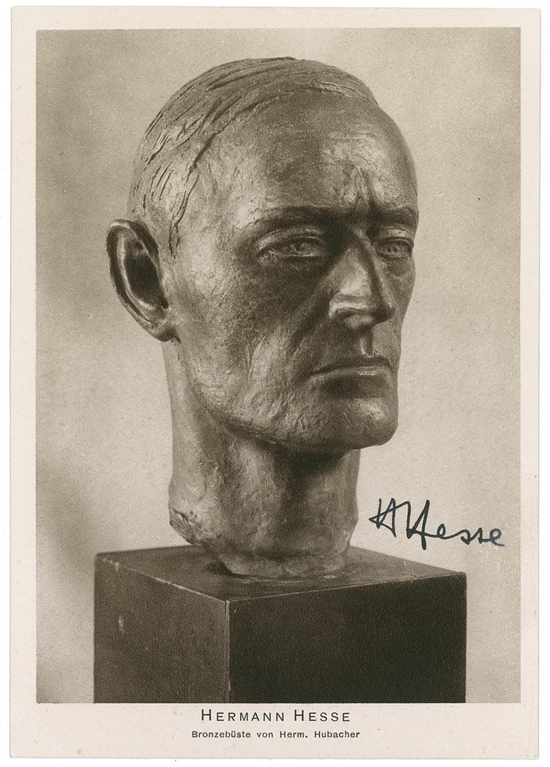 Influential, Nobel Prize–winning German author of such modern classics as Siddhartha (1922) and Steppenwolf (1927). Vintage 4 x 5.75 postcard photo of a bust sculpture of Hesse, signed in fountain pen, “H. Hesse.” Accompanied by the original mailing envelope. In fine, fresh condition, with a small crease to lower left corner tip. Pre-certified PSA/DNA and RRAuction COA.