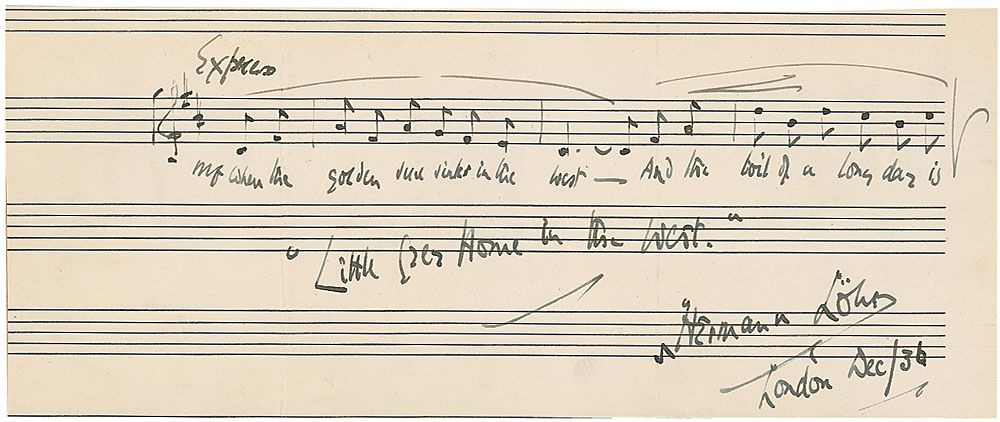 AMQS on an off-white 8.5 x 3.5 musically lined sheet. Lohr pens the four bars of music and lyrics which he identifies as “Little Grey Home in the West,” signed at the conclusion, “Hermann Lohr, London, Dec/36.” Affixed to a slightly larger sheet. In fine condition, with two vertical folds.