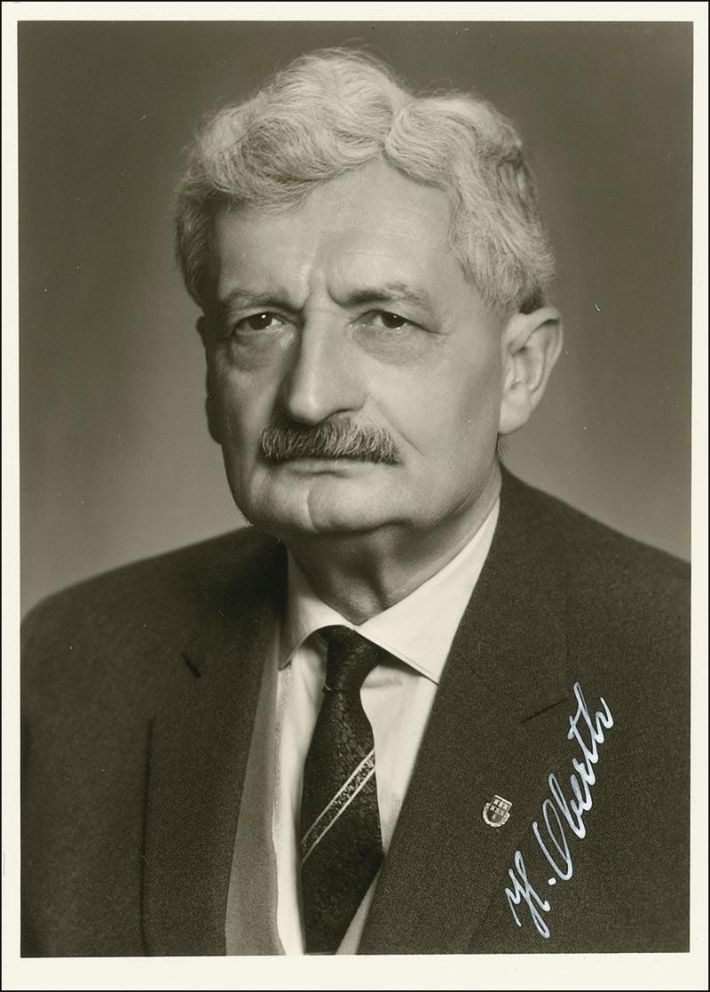 Romanian and German physicist and engineer (1894–1989) considered one of the founding fathers of rocketry and astronautics. Matte-finish 4.25 x 6 photo, signed in white ink, “H. Oberth.” In fine condition, with two small creases, one touching a portion of his name.