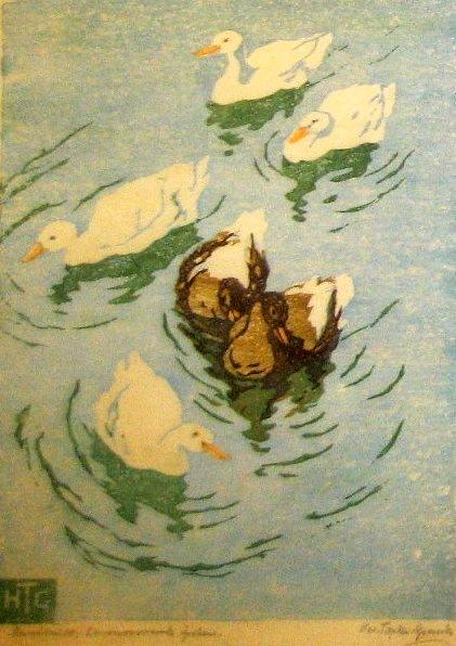 Hermann Tirpkin Gransky, european Art, , Ducks in a Lake, Woodcut in colors, 24x17cm, Signed., , , , ,