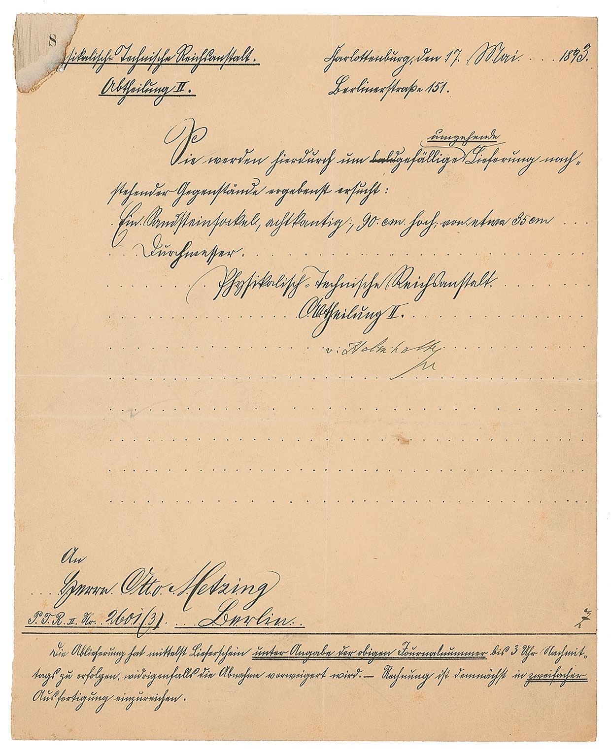 Partly-printed DS in German, signed “v. Helmholtz,” one page, 8.25 x 10.25, May 17, 1893. Untranslated prescription issued to Otto Metzing. In very good to fine condition, with scattered light creasing.