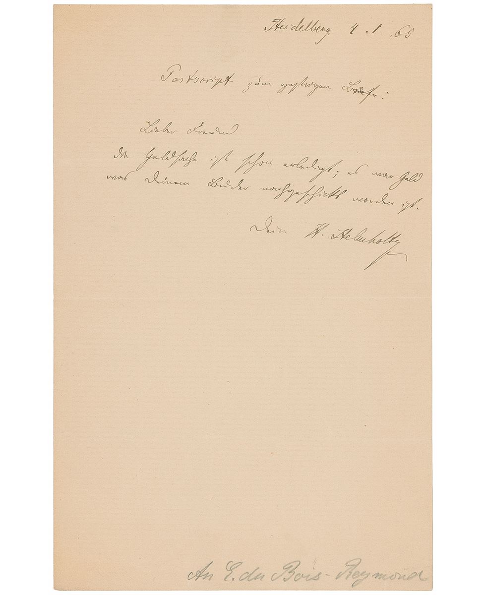 Versatile German scientist (1821–1894) known for his discoveries related to visual and aural perception, electrodynamics, and the conservation of energy. ALS in German, signed “H. Helmholtz,” one page, 5.5 x 8.5, January 4, 1865. Letter to Emil du Bois-Reymond. In full (translated): "Postscript to yesterday’s letters: The money thing is already done; it was money that had been forwarded to your brother.” In fine condition.