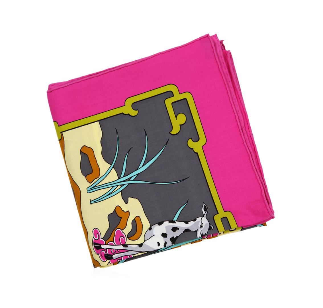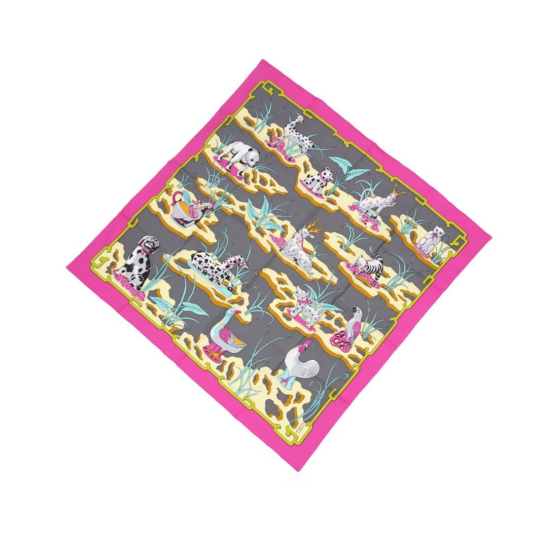 One Hermes cotton scarf in good condition, measuring 60cm by 60cm. The scarf features various animals in greyscale on yellow and pink platforms set against blue/green foliage with a pink border. Comes with an Hermes scarf box.