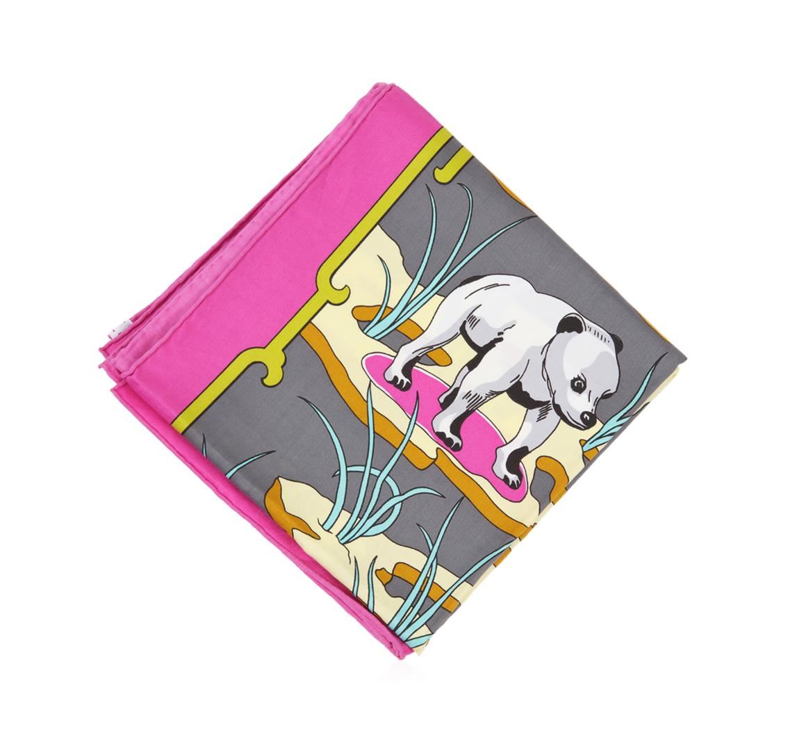 One Hermes cotton scarf in good condition, measuring 60cm by 60cm. The scarf features various animals in greyscale on yellow and pink platforms set against blue/green foliage with a pink border. Comes with an Hermes scarf box.