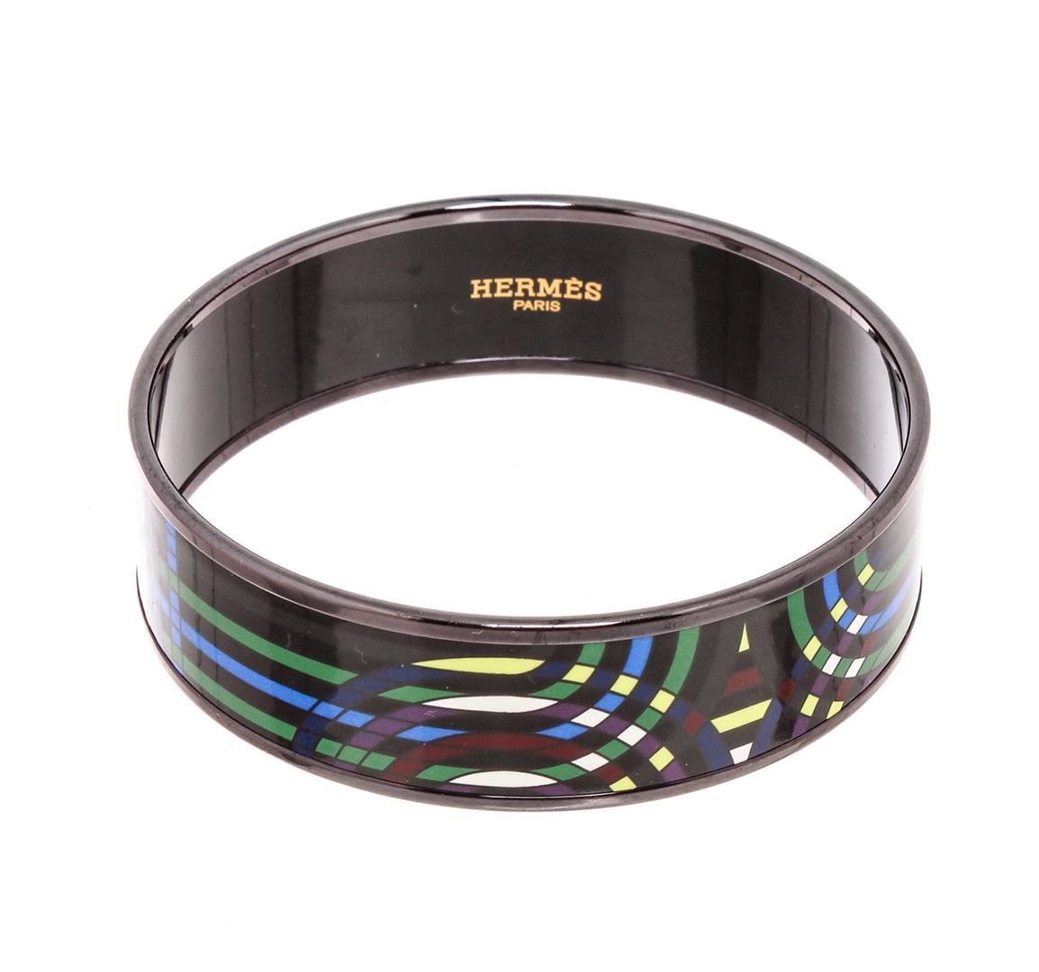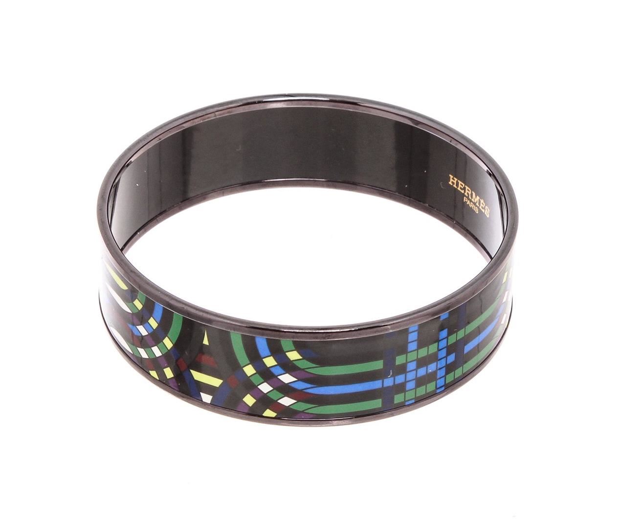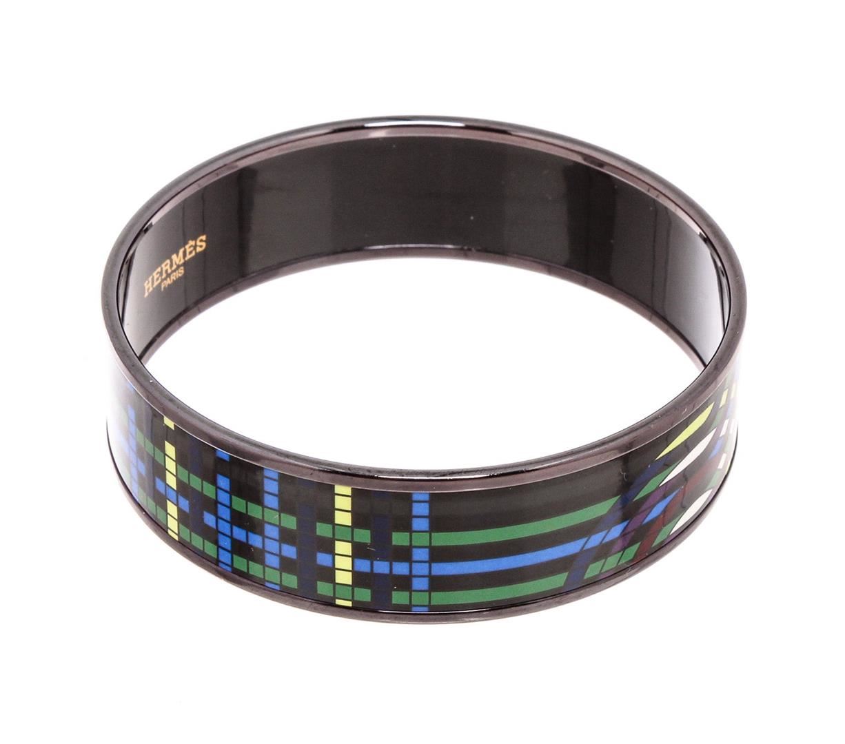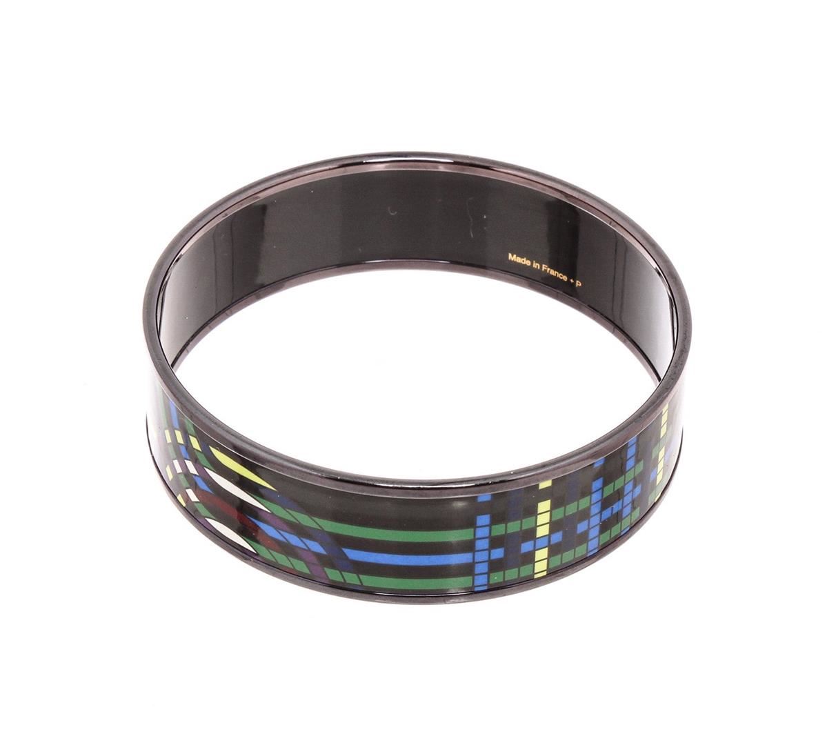 Hermes Bangle Bracelet Black multicolor Enamel. Brand: Hermes, Style: Bangle, Type: Bracelet, Exterior Color: Black multicolor, Exterior Material: EN/Amel.75. Condition: Very good, minor wear. Item is sold AS-IS and all information pertaining to this lot is available in the photos or this description.