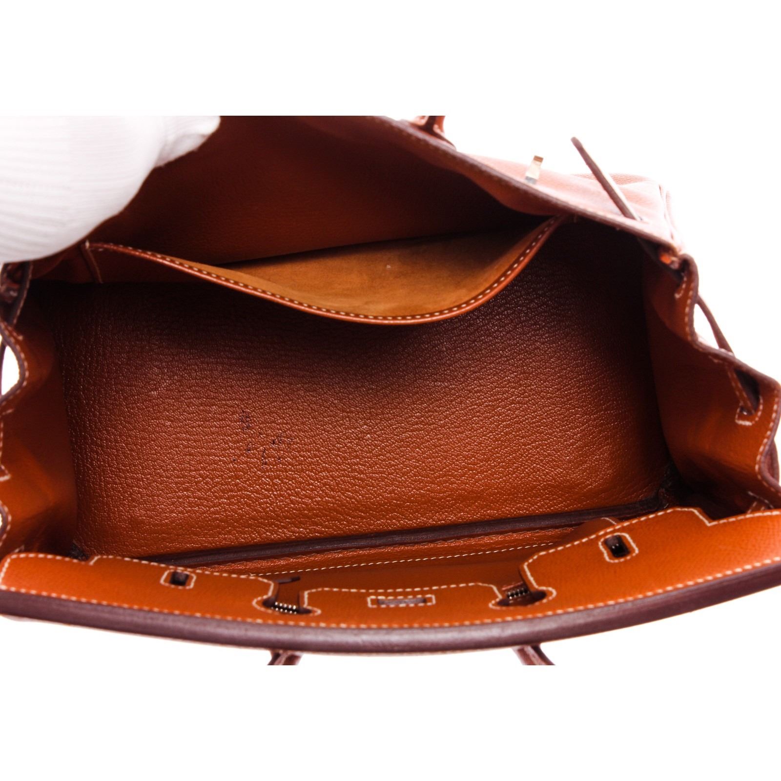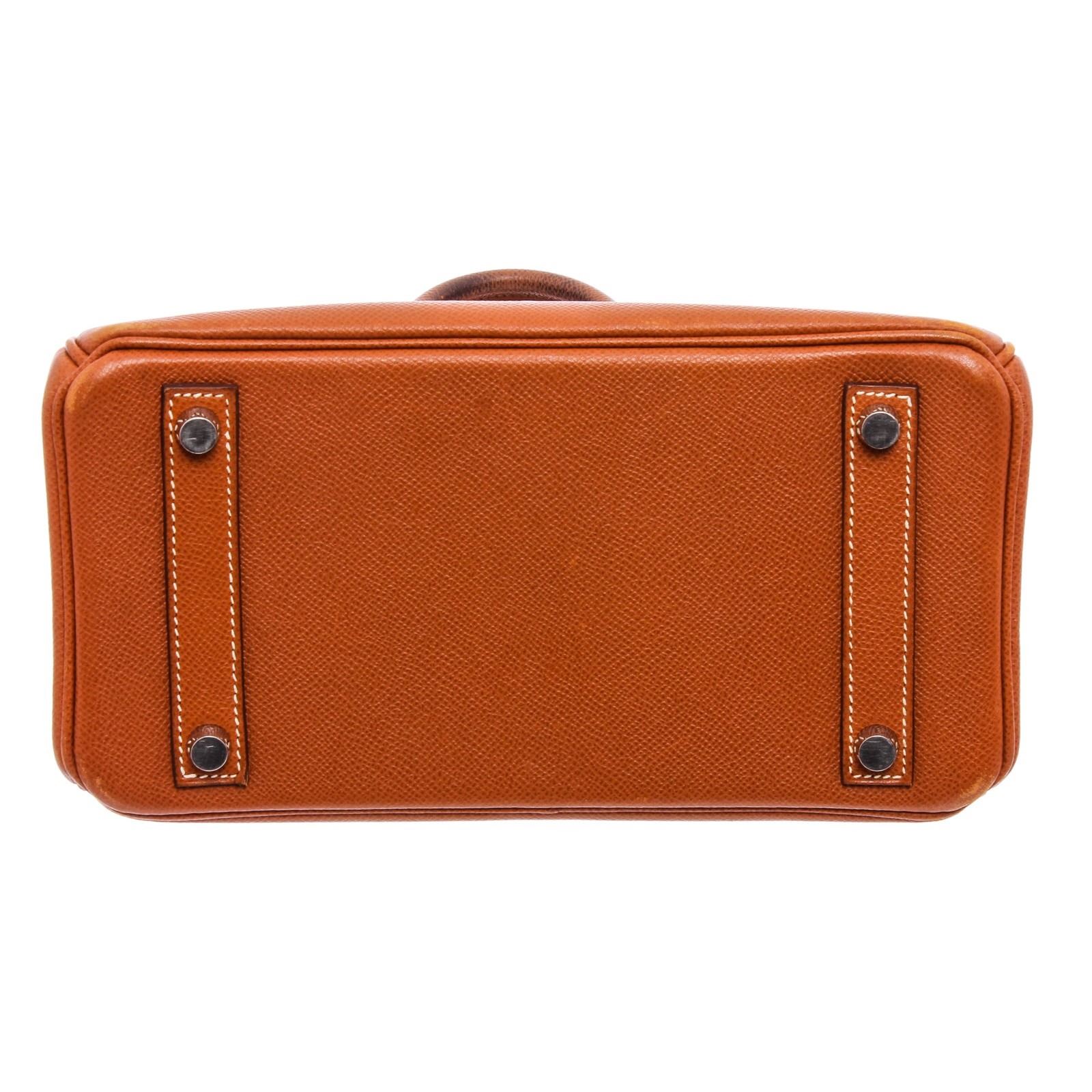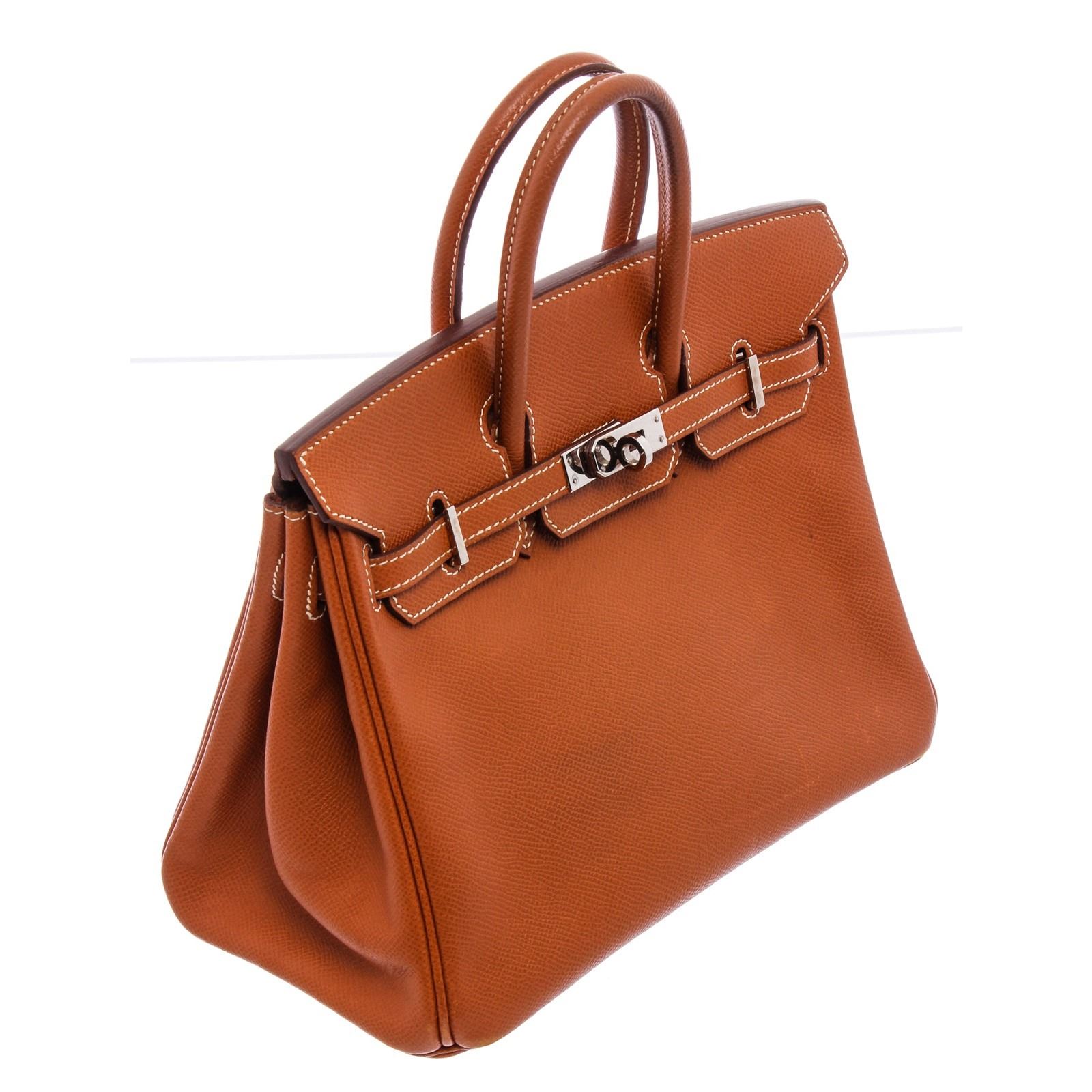 Brown Togo leather Hermès Birkin 25 with palladium-plated hardware, dual rolled top handles, sangle expansions at sides, foil stamped logo at flap underside, tonal leather lining, dual pockets at interior wall; one with zip closure and turn-lock closure at front flap.