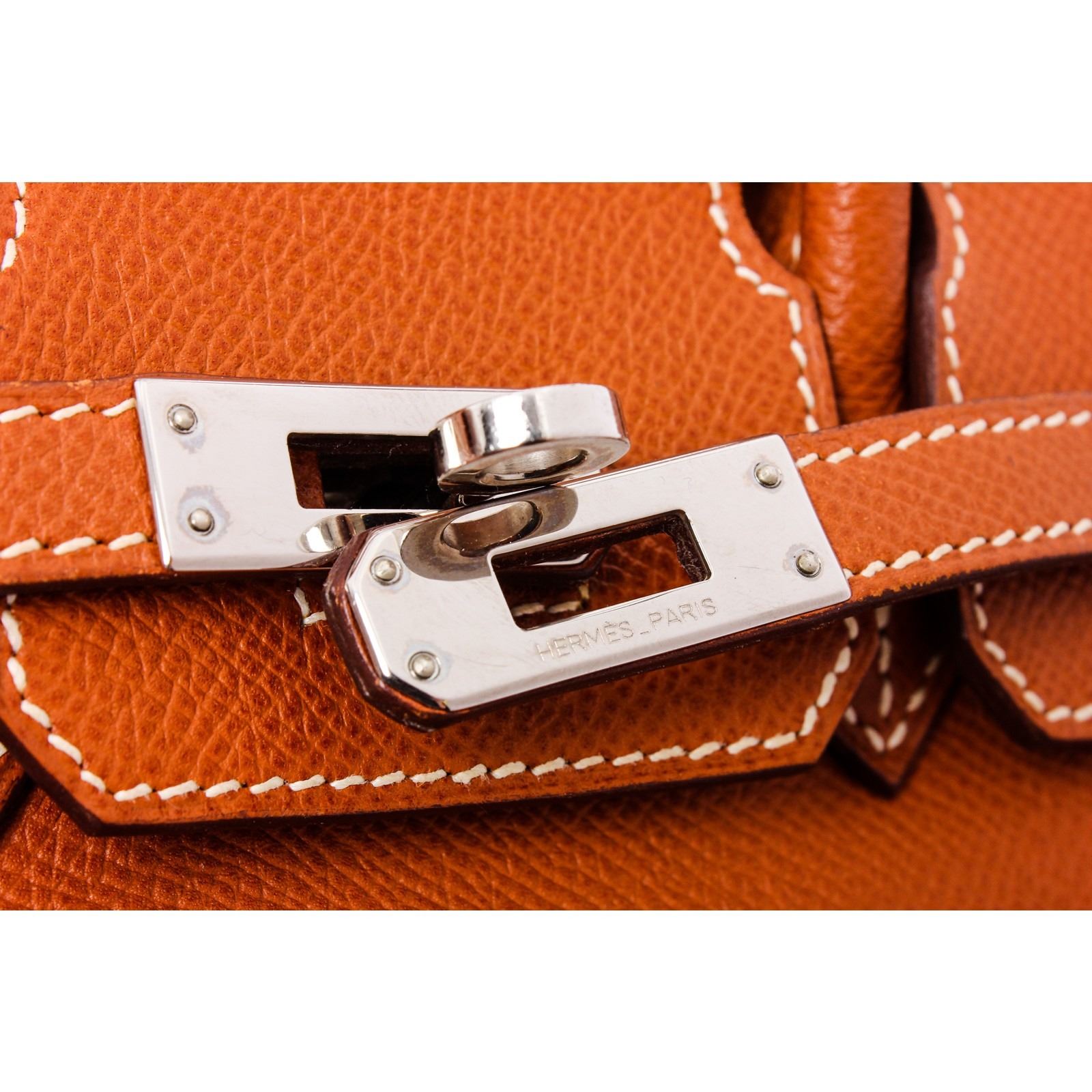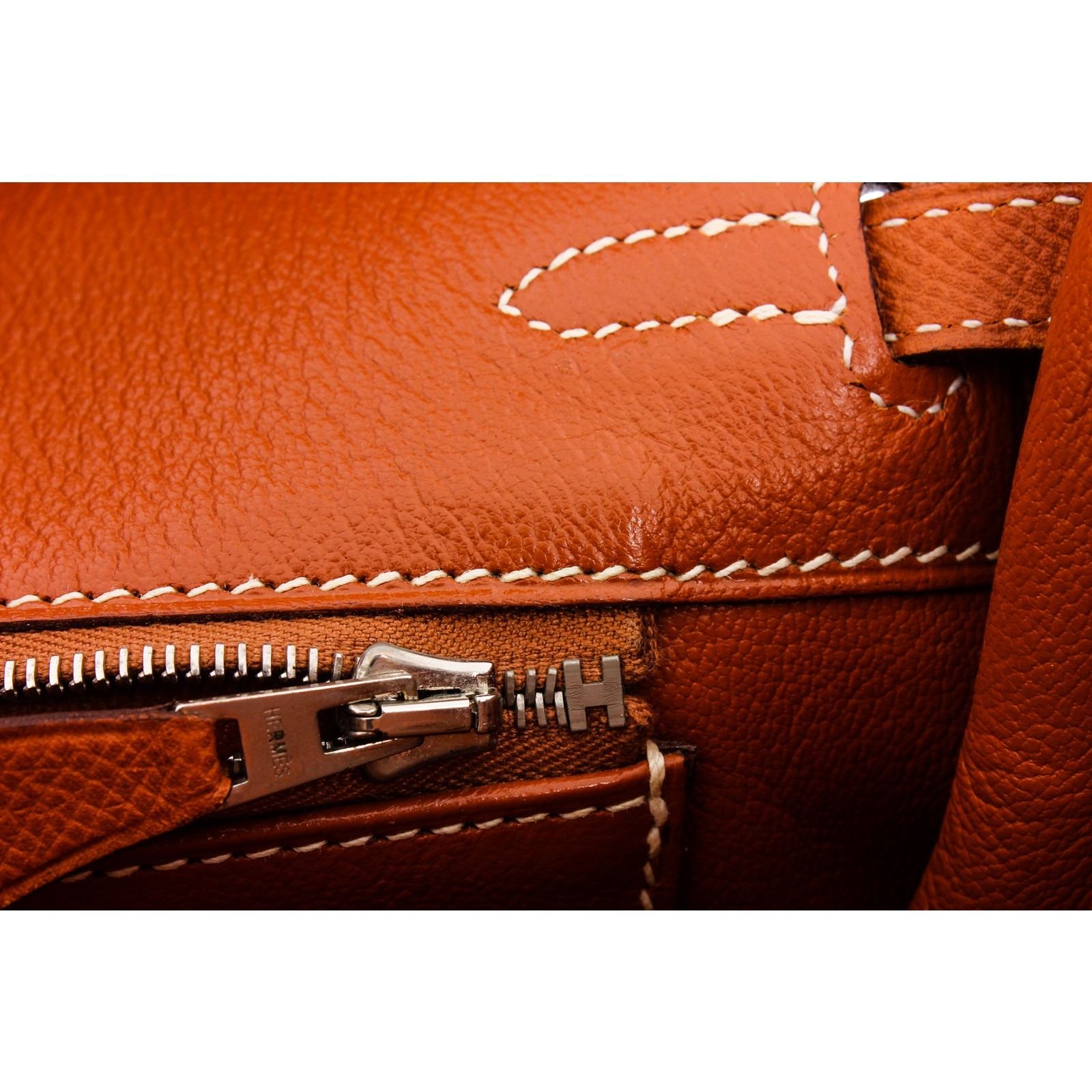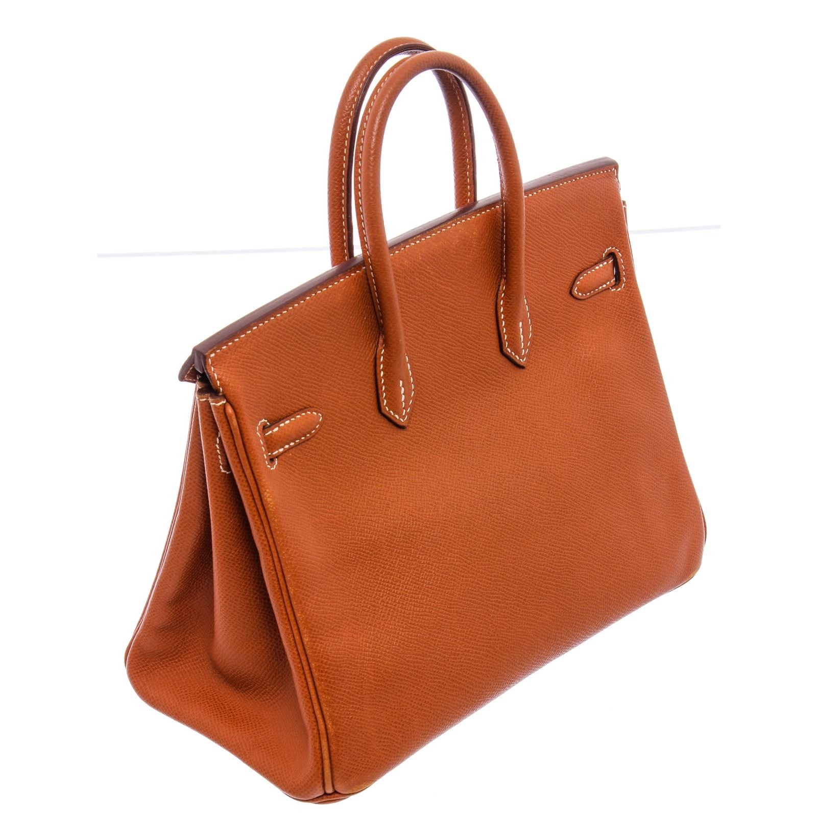 Brown Togo leather Hermès Birkin 25 with palladium-plated hardware, dual rolled top handles, sangle expansions at sides, foil stamped logo at flap underside, tonal leather lining, dual pockets at interior wall; one with zip closure and turn-lock closure at front flap.