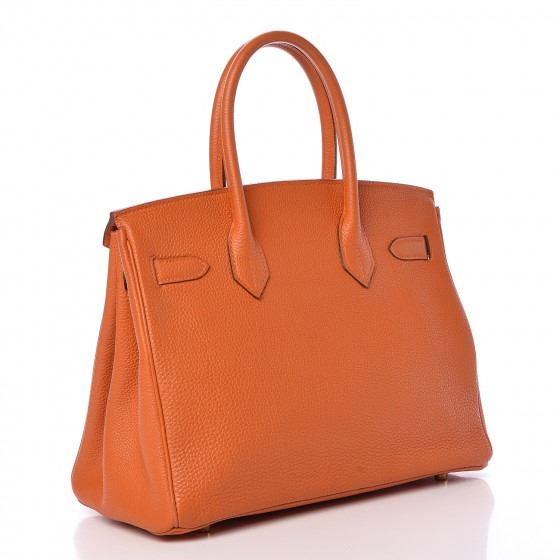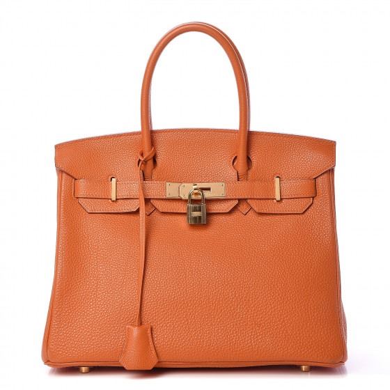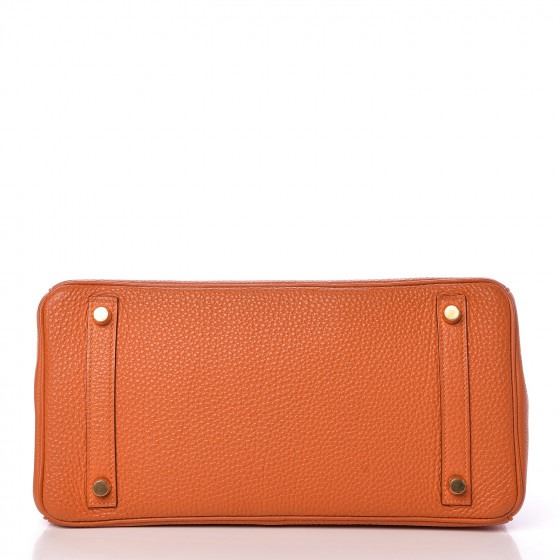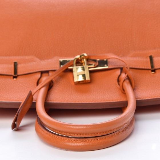Birkin handbag is crafted of luxurious togo calfskin leather in orange. This features rolled leather top handles, a cross over flap with a strap closure, a gold plated turn lock, and a padlock with a hanging clochette for the keys. This stunning handbag opens to a matte goatskin leather interior with zipper and patch