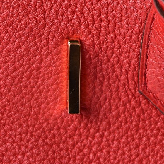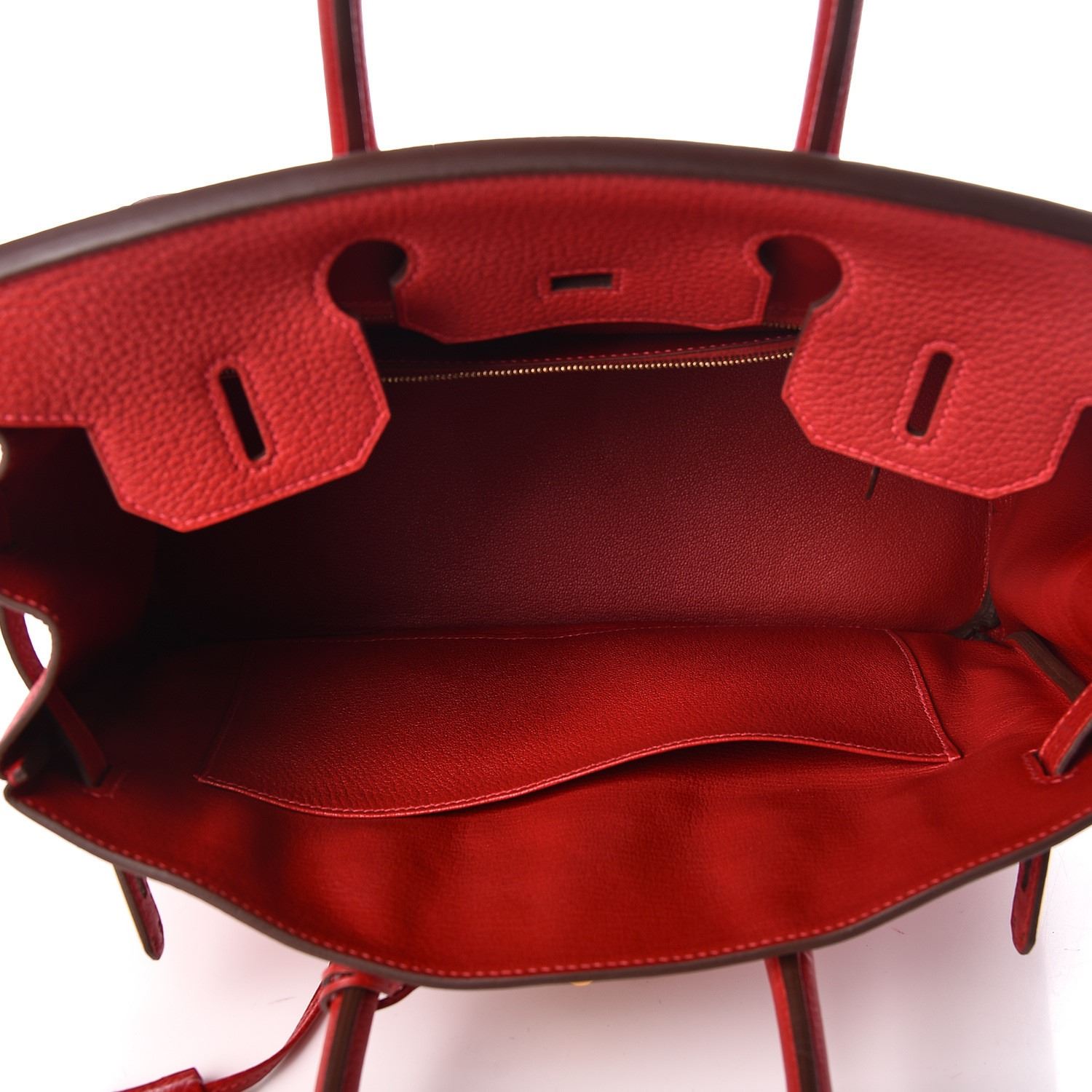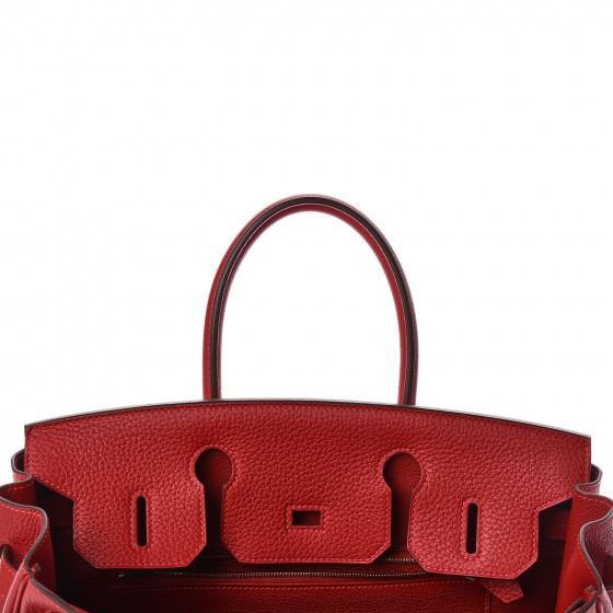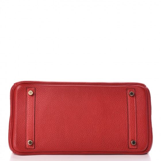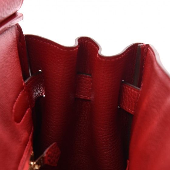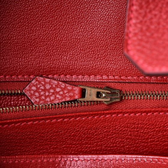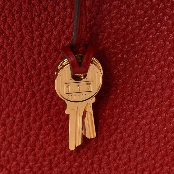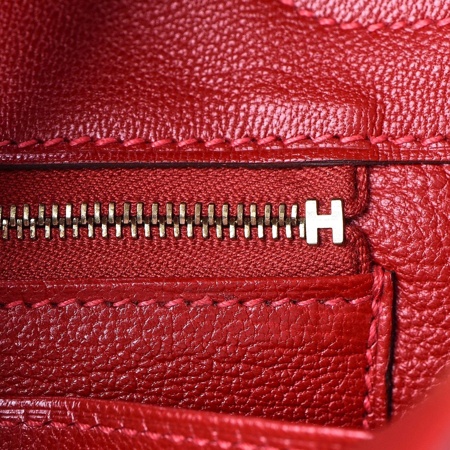 This handbag is finely crafted of rich togo calfskin leather in red. It features rolled leather top handles, a hanging clochette, leather straps, padlock, key, and a gold plated turn lock. The flap opens to a red chevre goatskin leather interior with zipper and patch pockets.