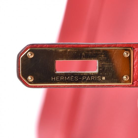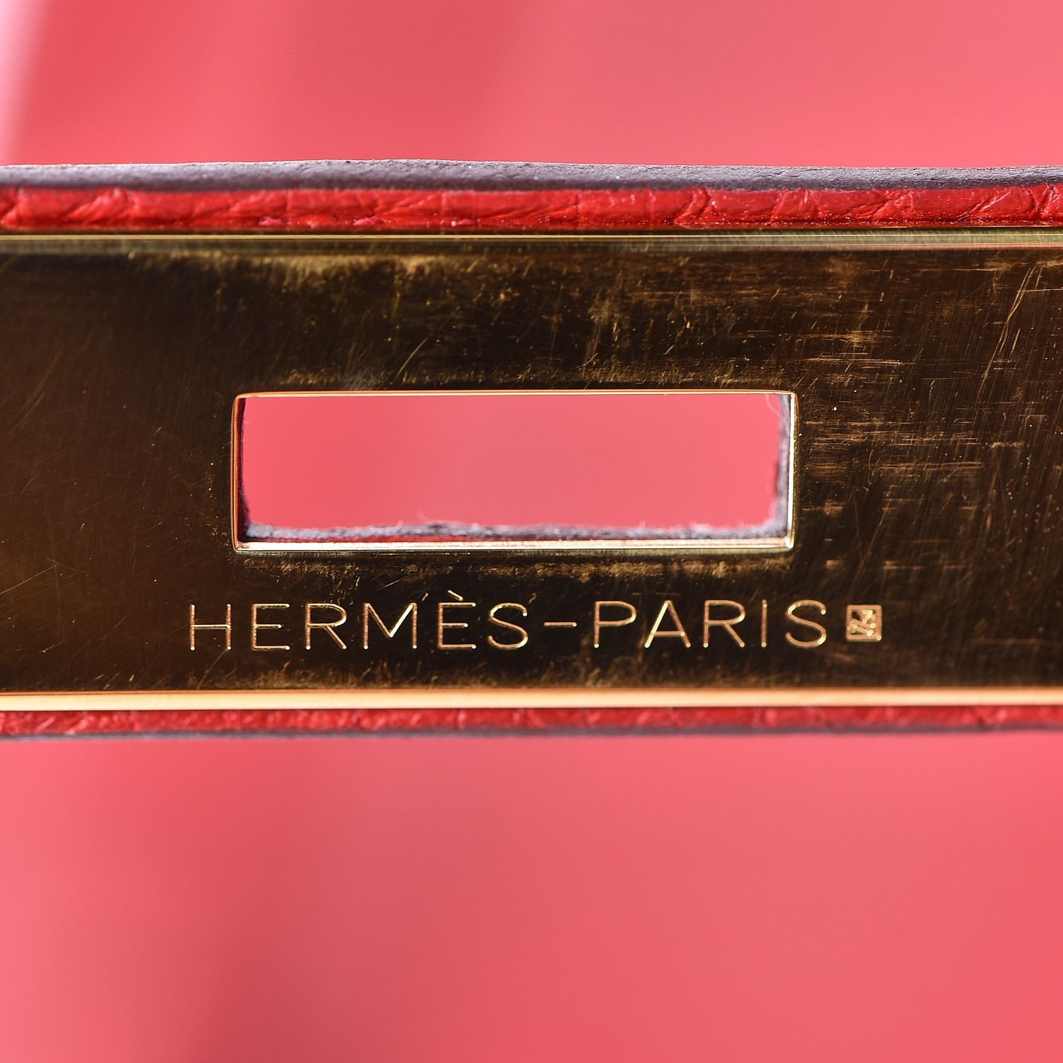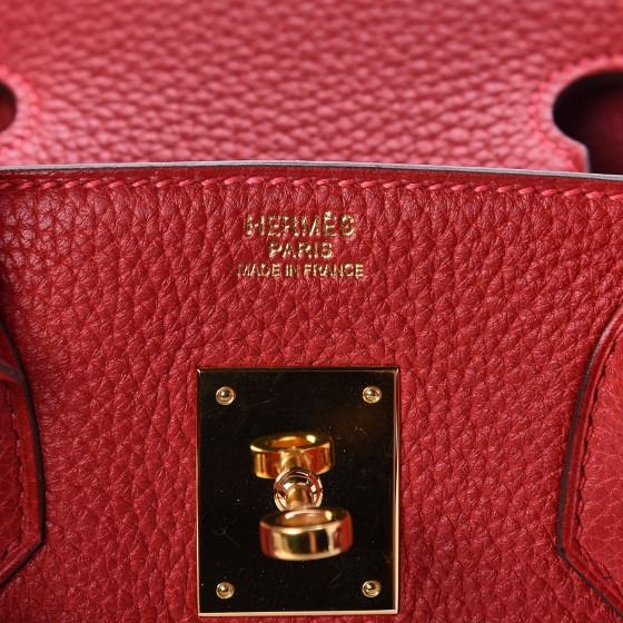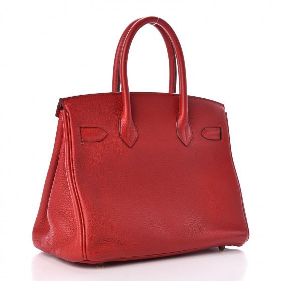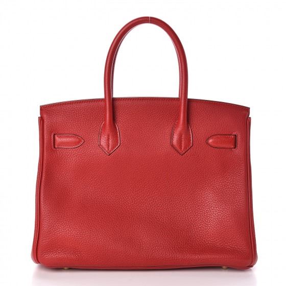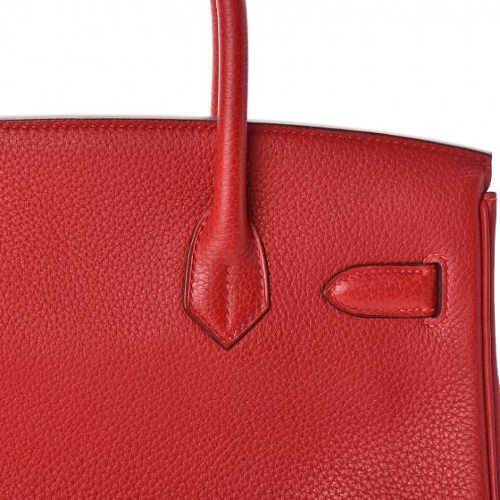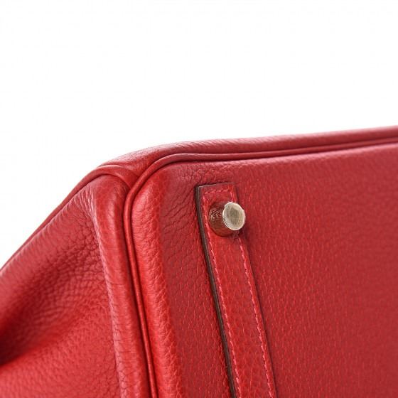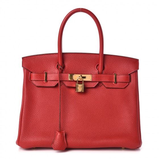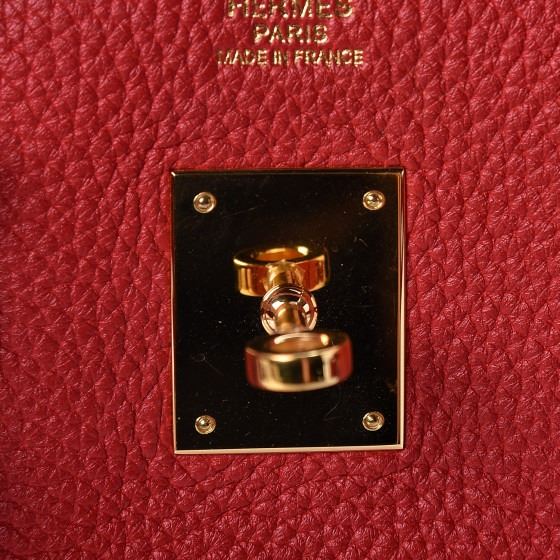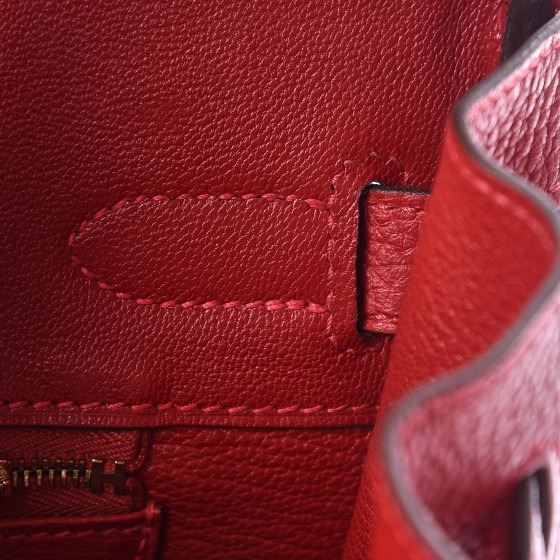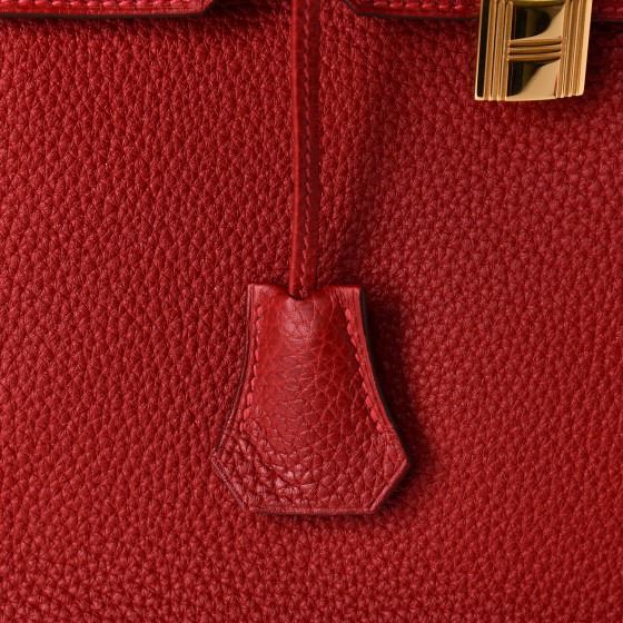 This handbag is finely crafted of rich togo calfskin leather in red. It features rolled leather top handles, a hanging clochette, leather straps, padlock, key, and a gold plated turn lock. The flap opens to a red chevre goatskin leather interior with zipper and patch pockets.