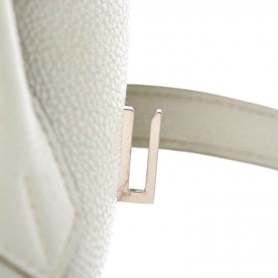 Handbag is finely hand crafted of togo calfskin leather in a lovely shade of light grey. The bag features rolled leather top handles, a short flap and a cinch style strap closure with silver palladium plated links secured by a signature silver turn lock and optional padlock and a leather covered key clochette. The flap opens to a matching matte chevre goatskin leather interior with zipper and patch pockets.