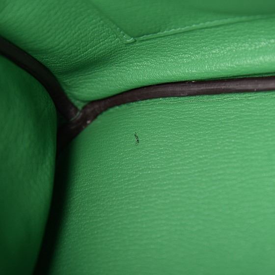 Taurillon Clemence Birkin 30 Bambou handbag is superbly constructed of grained leather in a bright bamboo shade of green. The bag features rolled leather top handles, a cross over flap and strap closure, palladium silver hardware, and a padlock with a hanging clochette for the keys. This opens to a chevre goatskin leather interior with zipper and patch pockets