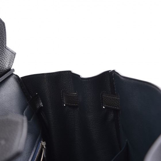 This classic handbag is finely crafted of togo calfskin leather in darkest blue. This features looping leather top handles, a cross over flap and strap closure, and a palladium silver plated turn lock and padlock. The top flap opens to a chevre leather dark blue lining with zipper and patch pockets.