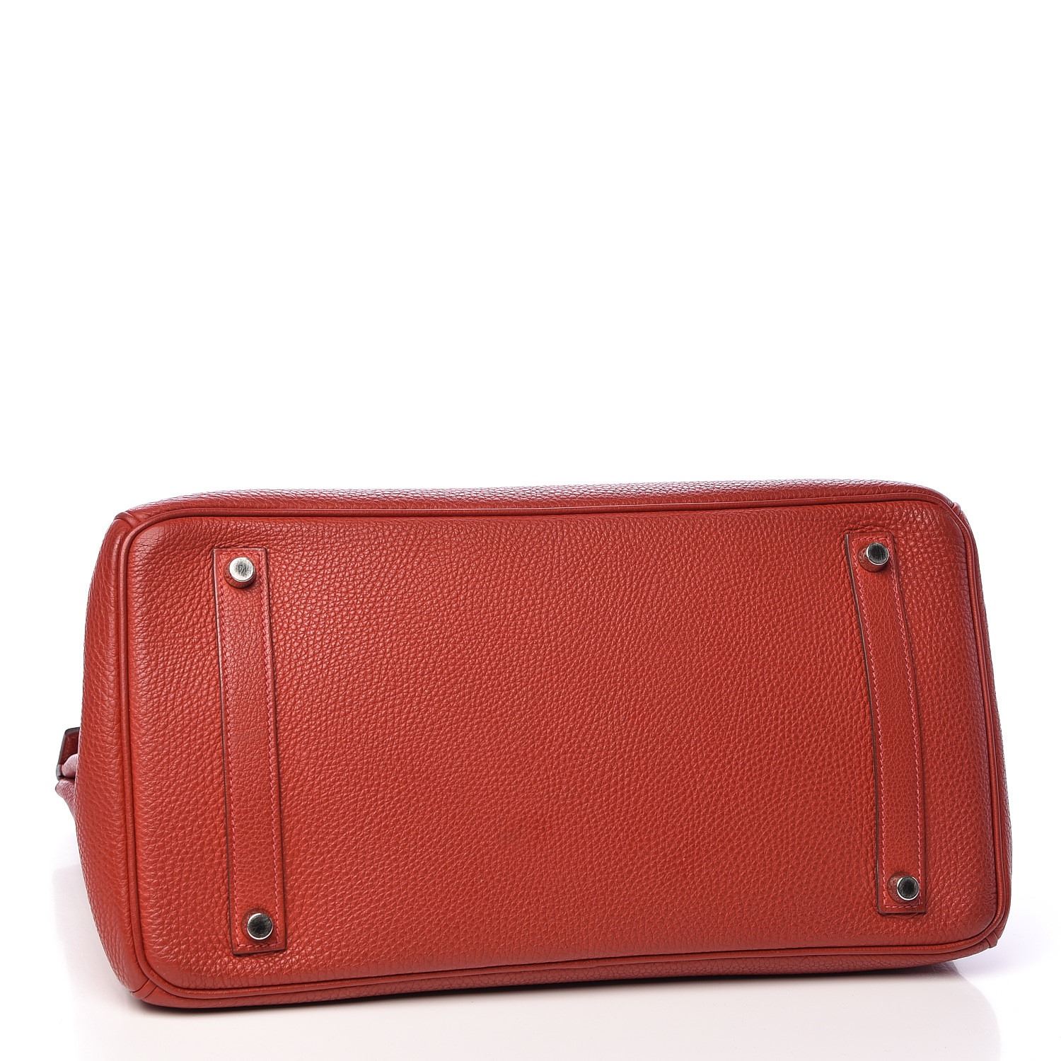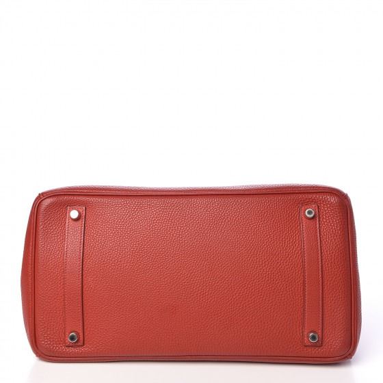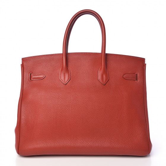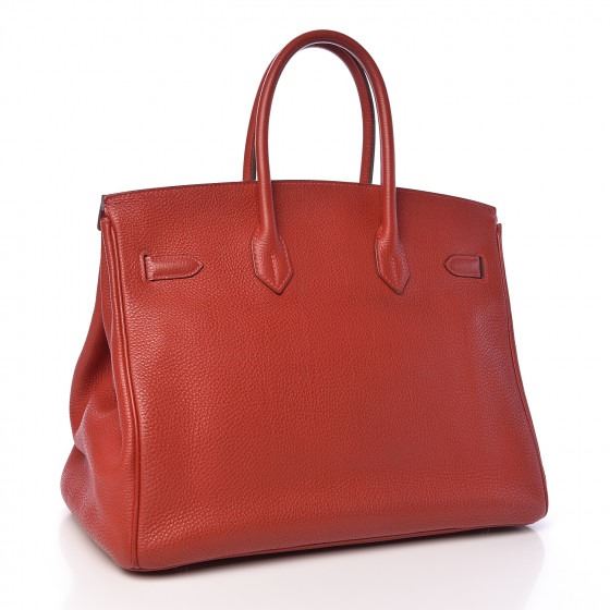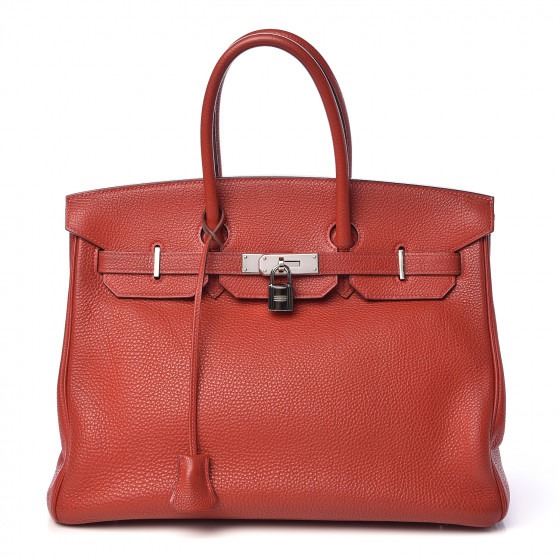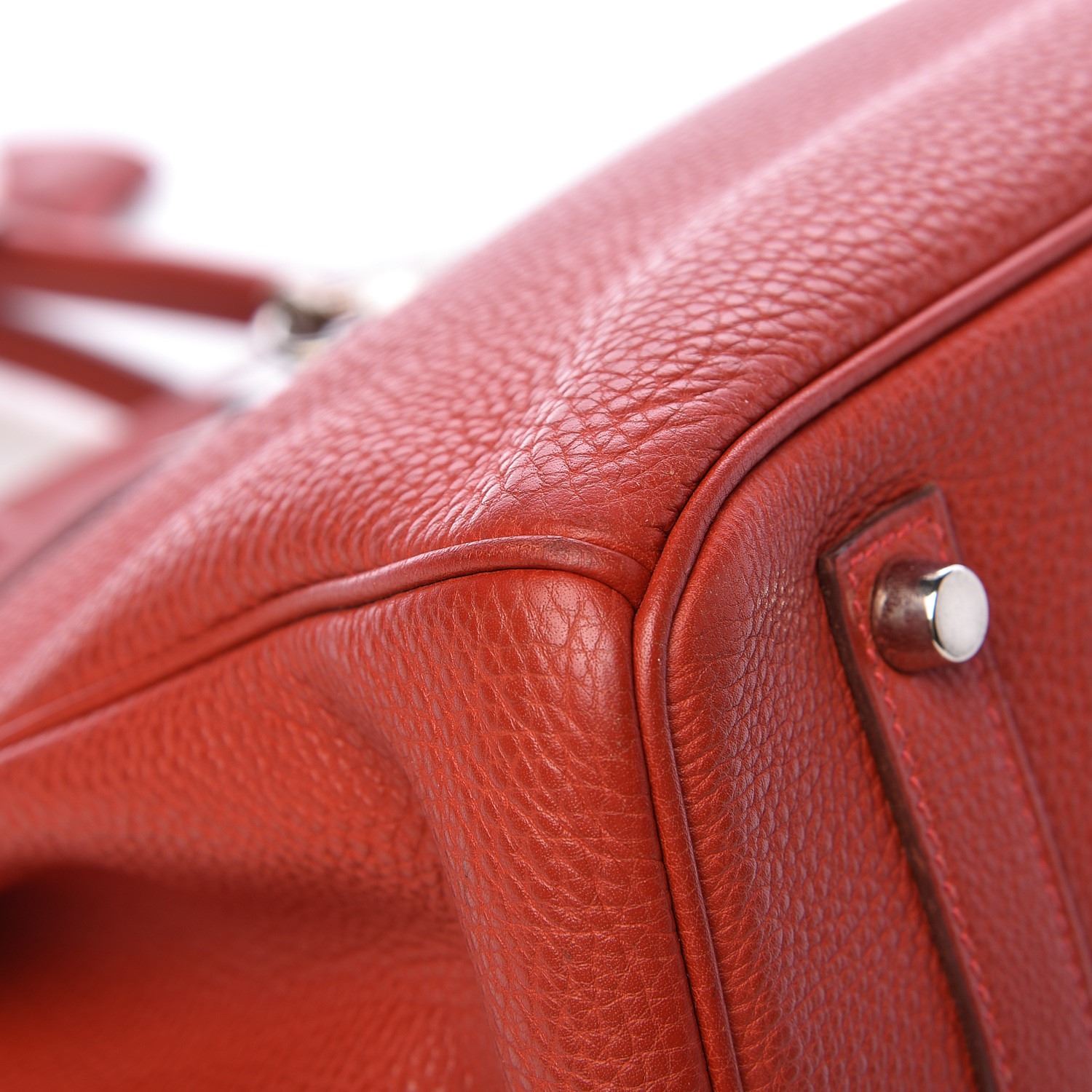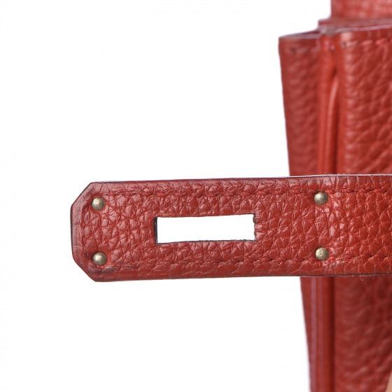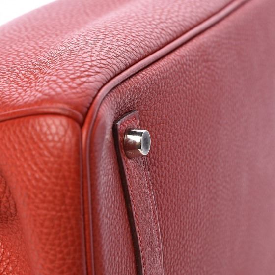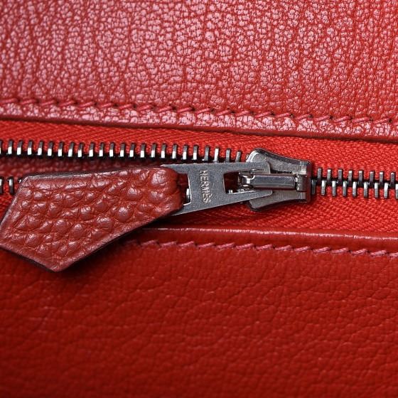 Brique tote is beautifully crafted of togo calfskin leather in burnt red. The bag features rolled leather top handles, a frontal flap, and palladium plated strap links with a front turn lock. This opens the top flap to a matching chevre goatskin leather interior with zipper and patch pockets.