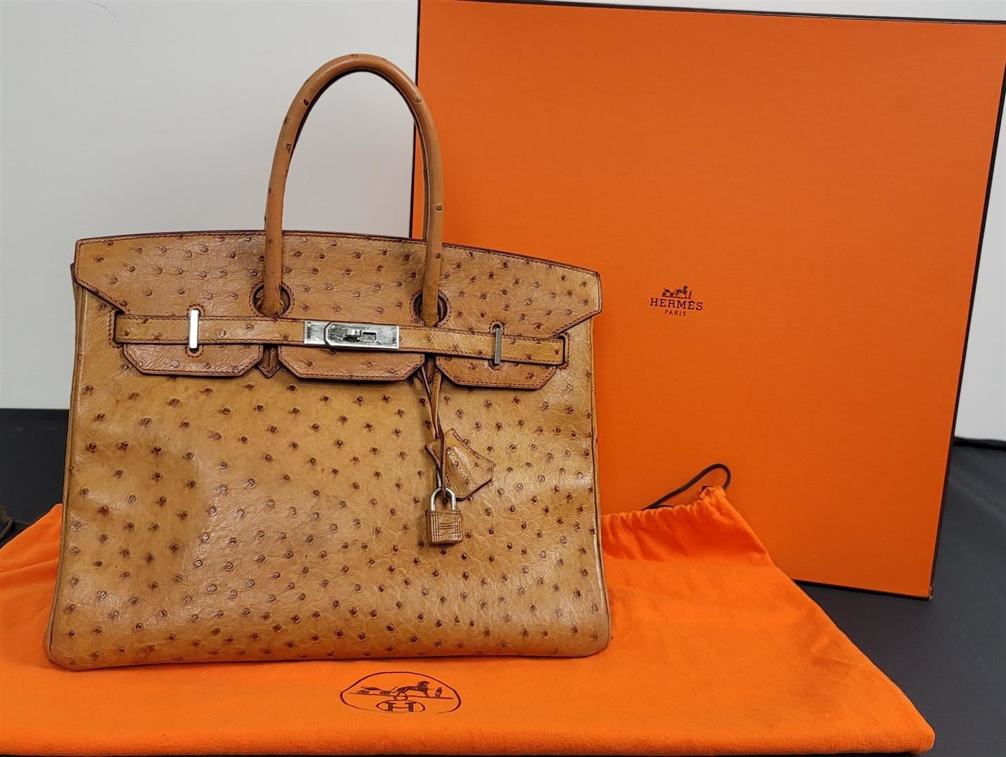 Hermes Birkin 35 featured in Cognac Brown. Hermès 'Birkin 35' bag in Cognac ostrich leather. Lined in Chevre (goat skin) with an open pocket against the front and a zipper pocket against the back. Comes with clochette, keys, lock and dust bag. Height 25cm (9.8in) Width 35cm (13.7in) Depth 17cm (6.6in) Drop of the Handle 10cm (3.9in) Hardware Palladium Blindstamp J in a Square 100% Guaranteed to be Authentic! Comes with a certified Authentication!! CONDITION: This bag is PRE OWNED but in GREAT condition - https://www.bababebi.com/opinion-short/19371