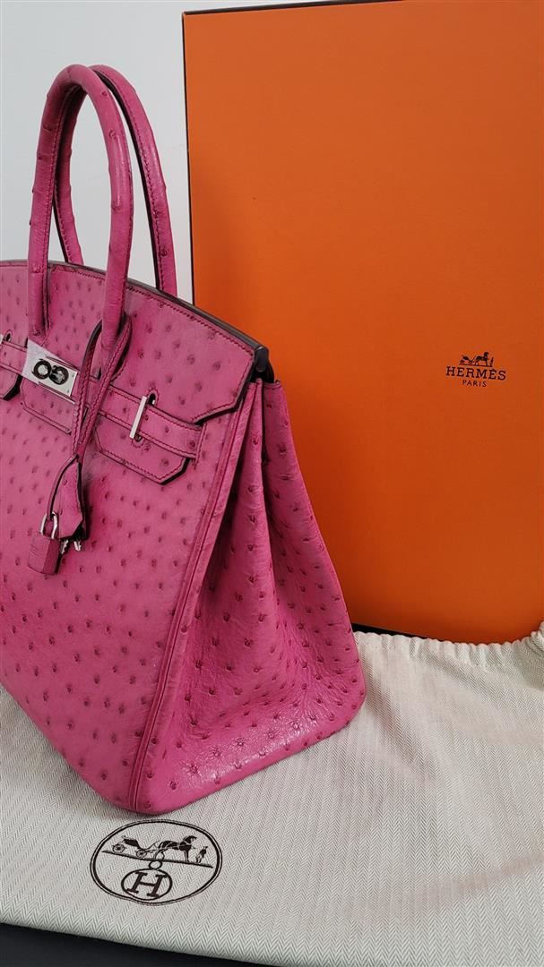 Hermes Birkin 35 featured in Pink Ostrich. This Hermes Birkin is lush with Palladium hardware. Comes with lock, keys, clochette, sleeper and signature Hermes orange box. 100% Guaranteed to be Authentic! Comes with a certified Authentication from Real Authentication!! BAG MEASURES: LENGTH 35cm / 14\"TALL 28cm / 11\" DEEP 18cm / 7\" HANDLES: TALL 5\" CONDITION: Pre Owned but GREAT condition! https://www.realauthentication.com/certificates/ad3b1ccf-06bc-4577-8b05-1b24b9930a85