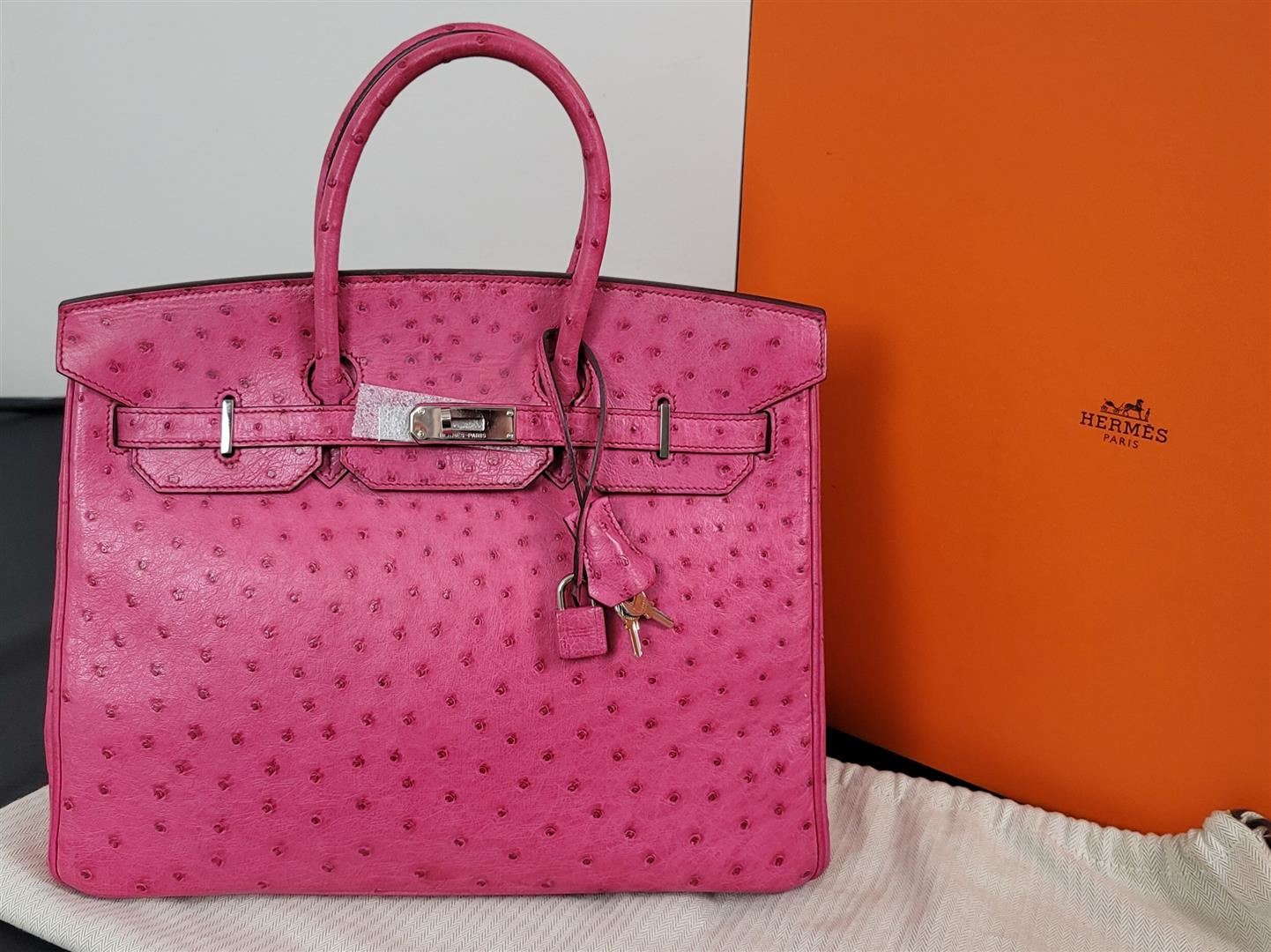 Hermes Birkin 35 featured in Pink Ostrich. This Hermes Birkin is lush with Palladium hardware. Comes with lock, keys, clochette, sleeper and signature Hermes orange box. 100% Guaranteed to be Authentic! Comes with a certified Authentication from Real Authentication!! BAG MEASURES: LENGTH 35cm / 14\"TALL 28cm / 11\" DEEP 18cm / 7\" HANDLES: TALL 5\" CONDITION: Pre Owned but GREAT condition! https://www.realauthentication.com/certificates/ad3b1ccf-06bc-4577-8b05-1b24b9930a85
