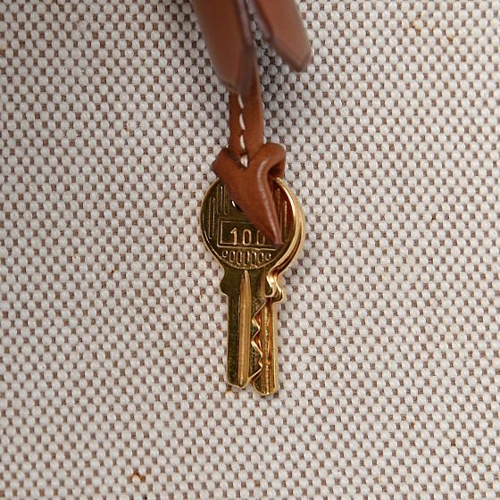 Tote is crafted of fine natural toile canvas and features luxurious cowhide leather trim at the corners, the top crest, and sturdy rolled top handles. The closure includes leather straps with gold plated hardware including a gold turn-lock, padlock and keys inside a leather-covered clochette. The flap opens to a matching leather interior with zipper and patch pockets.