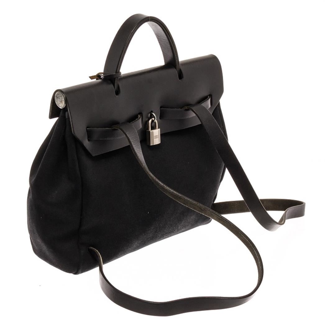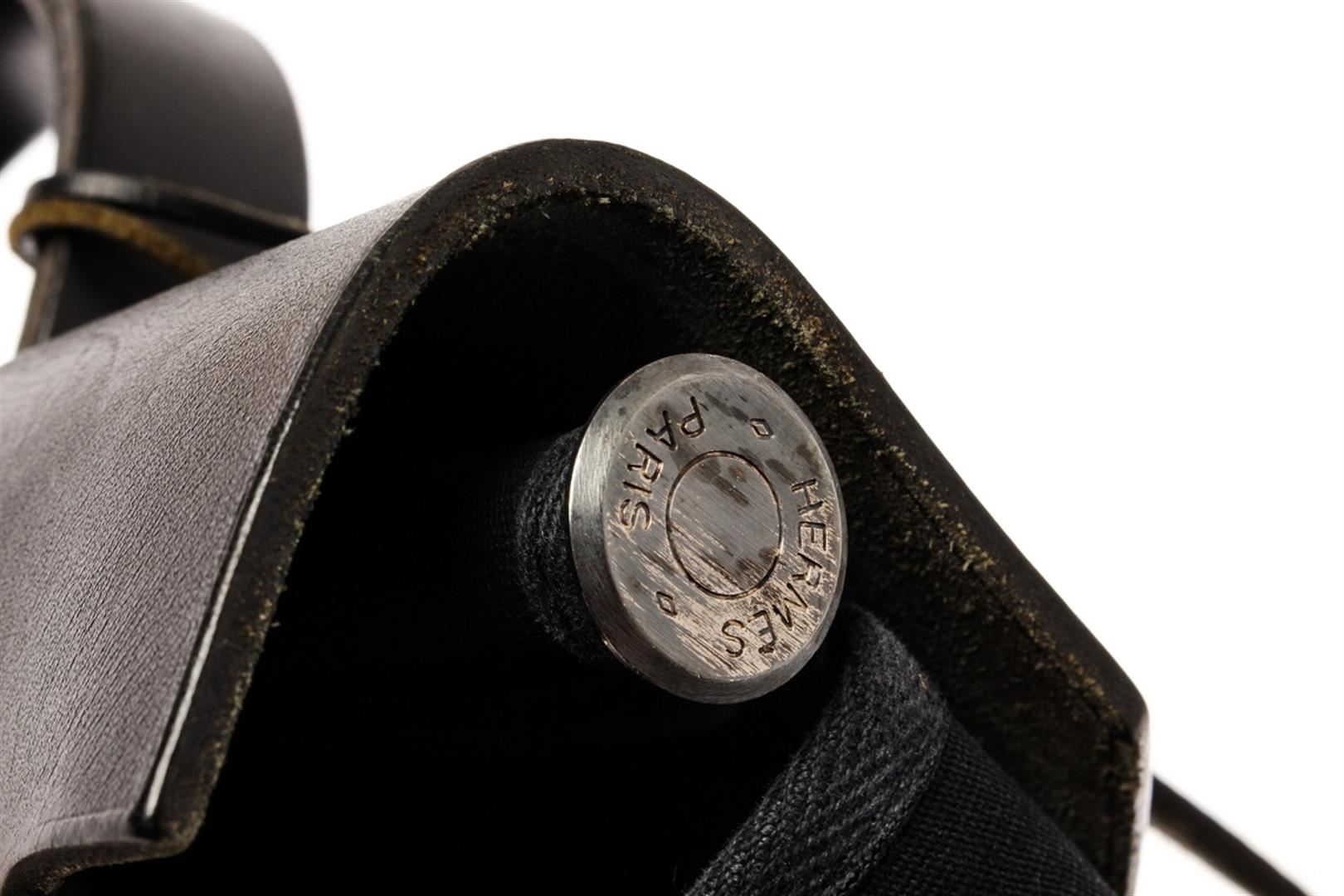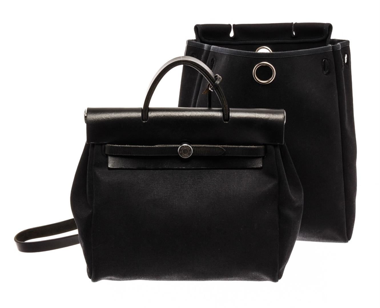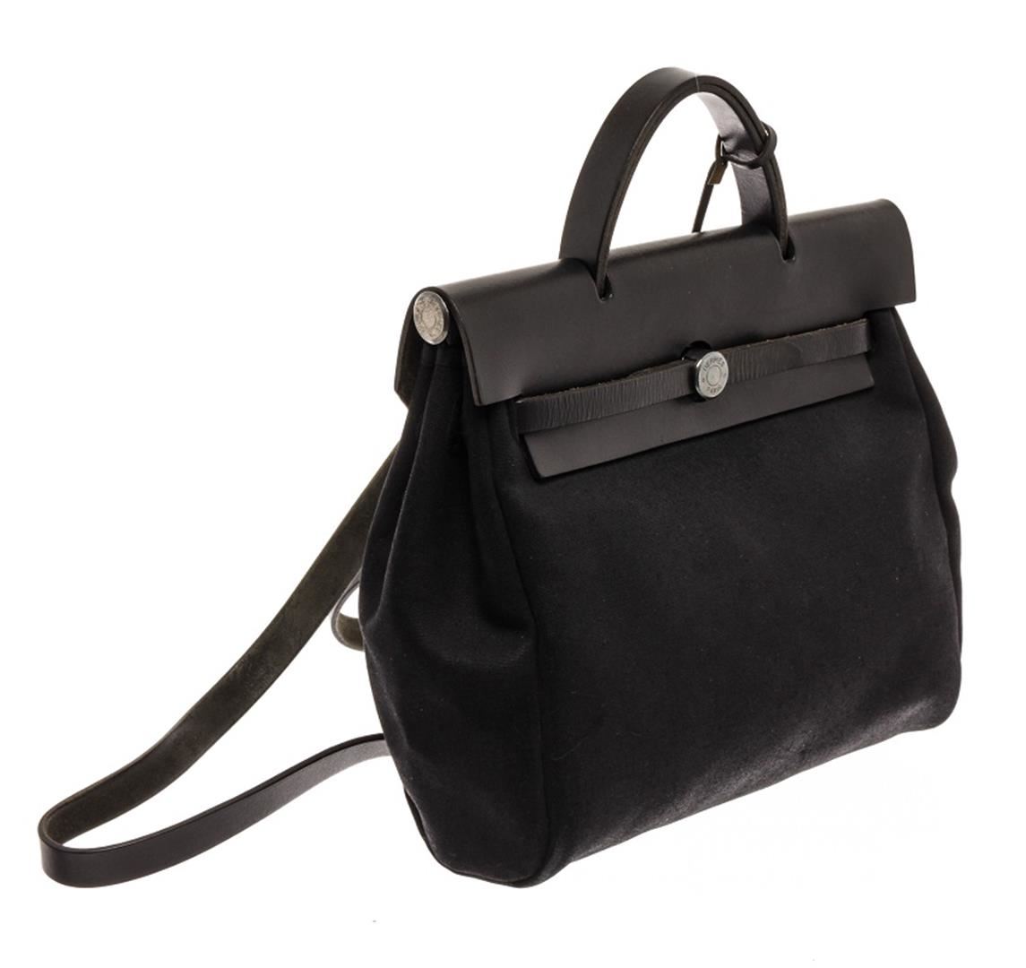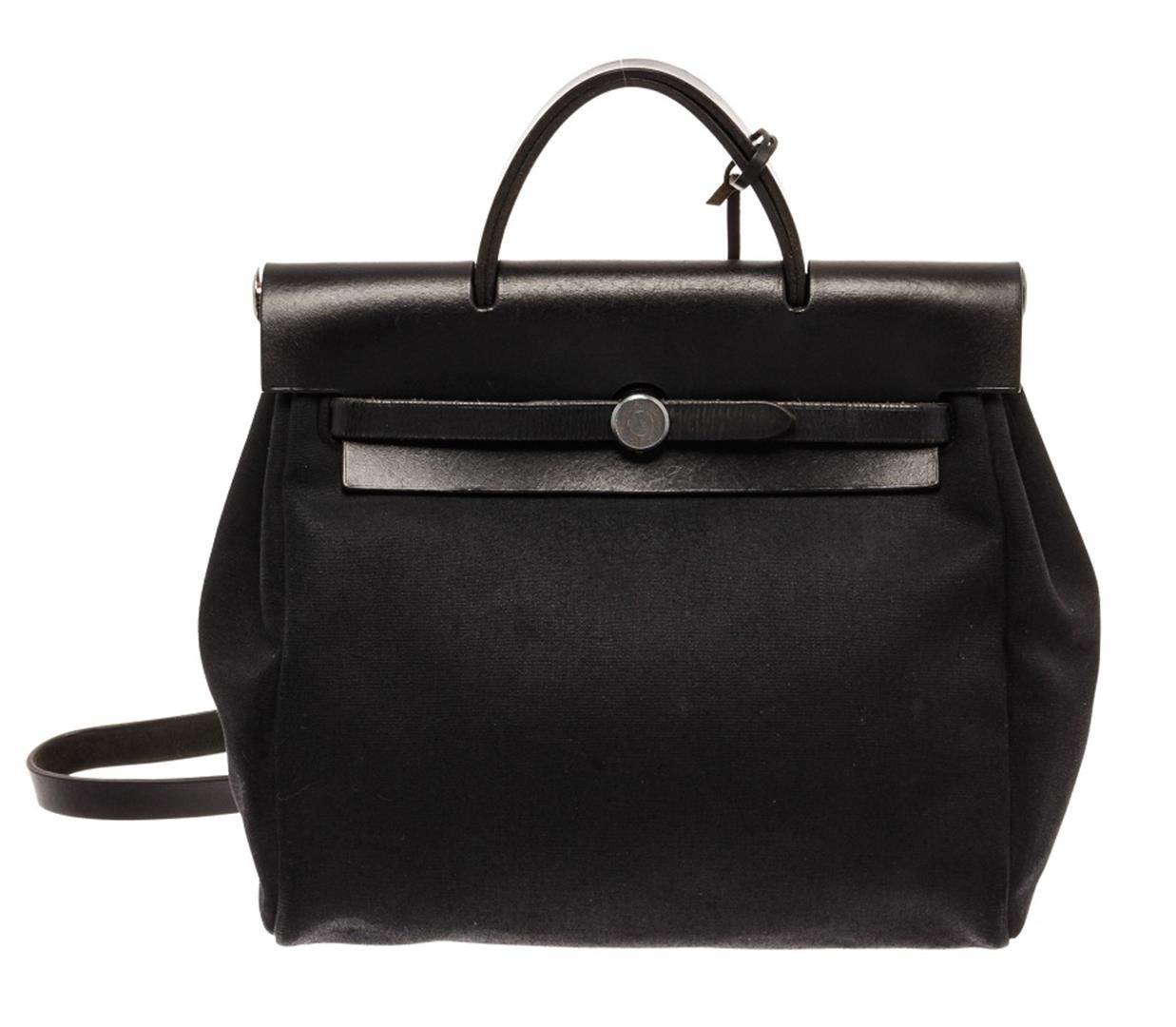 Hermes Black Canvas Toile Off Herbag. All available information is listed in the description and shown in the photos. Hermes Black Canvas Toile Off Herbag with alladium-plated hardware, leather trim, flat handle, single shoulder strap and pull-through closure at front. Height: 15.5" Width: 19.5" Depth: 5.5", Handle Drop: 2.25" / 39.37 x 49.53 x 13.97 Cm