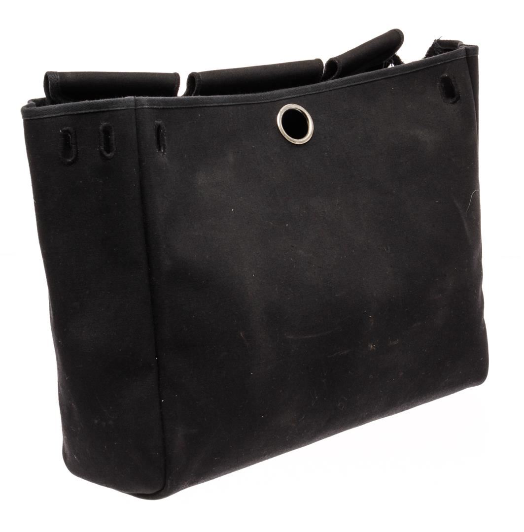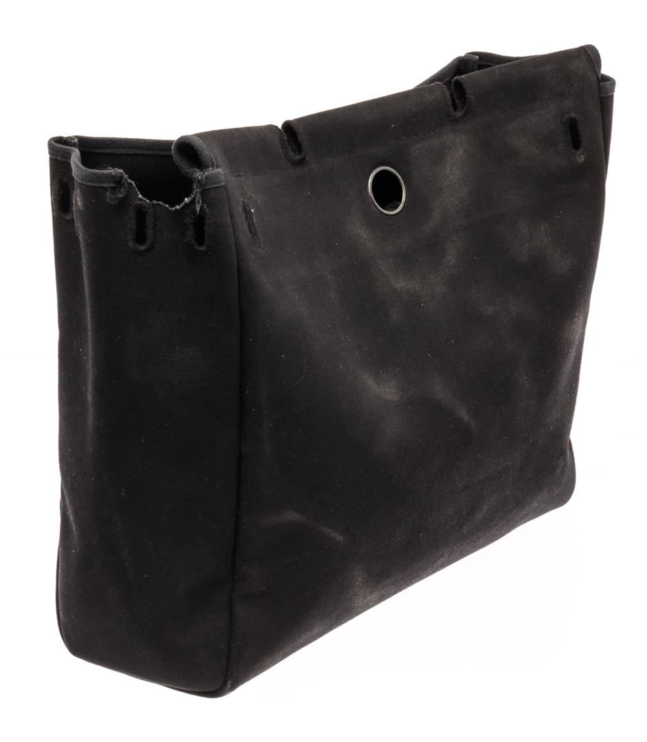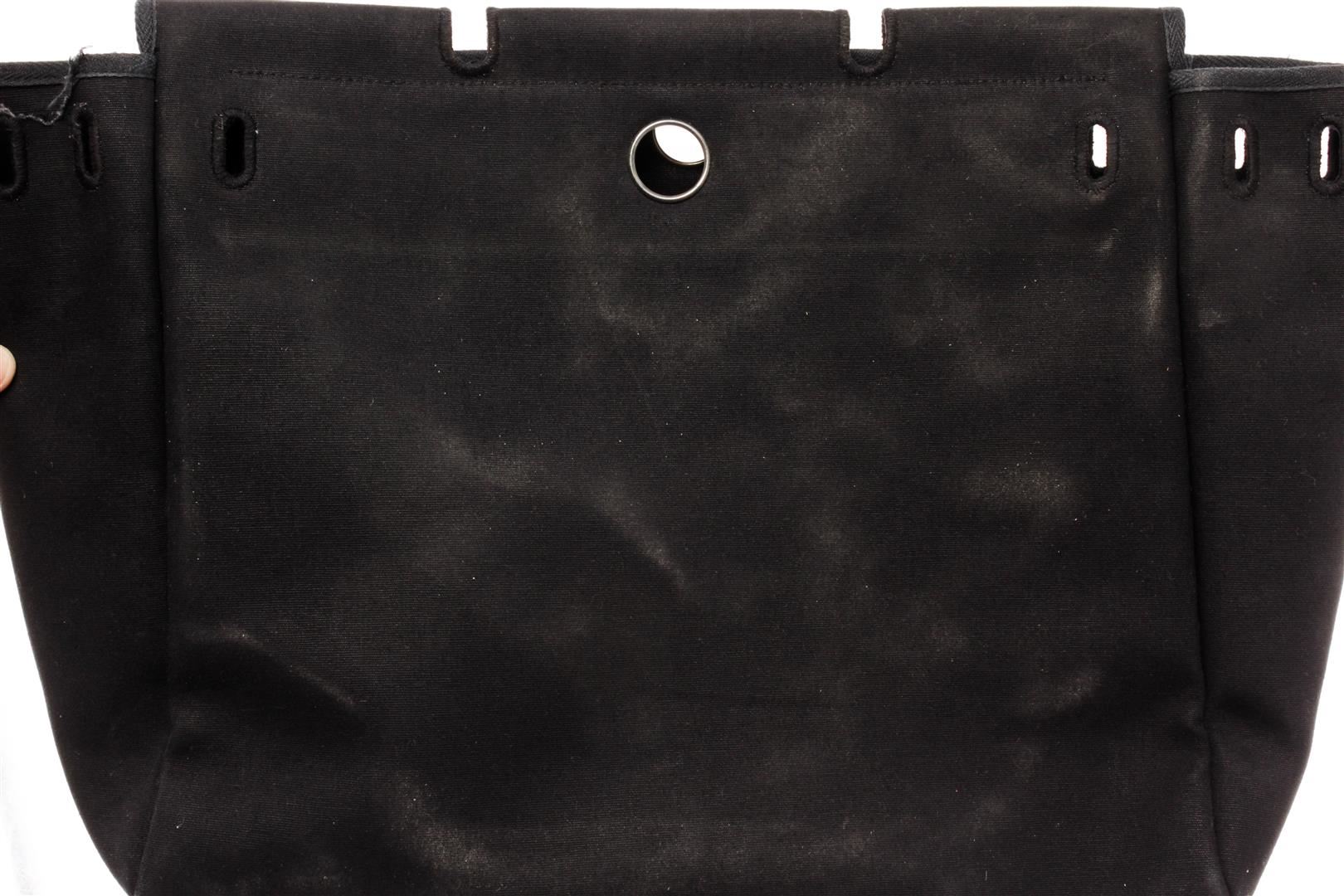 Hermes Black Canvas and Leather Insert Her Bag. All available information is listed in the description and shown in the photos. Hermes Black Canvas and Leather Insert Her Bag with vintage, noir toile officier canvas, palladium-plated hardware, flat handles & single shoulder strap leather trim embellishment, clasp closure at front, includes lock & keys.