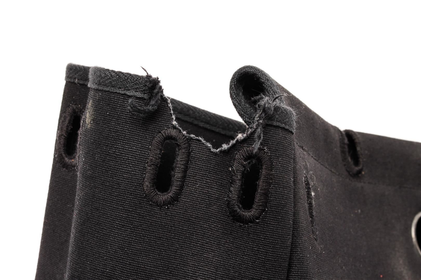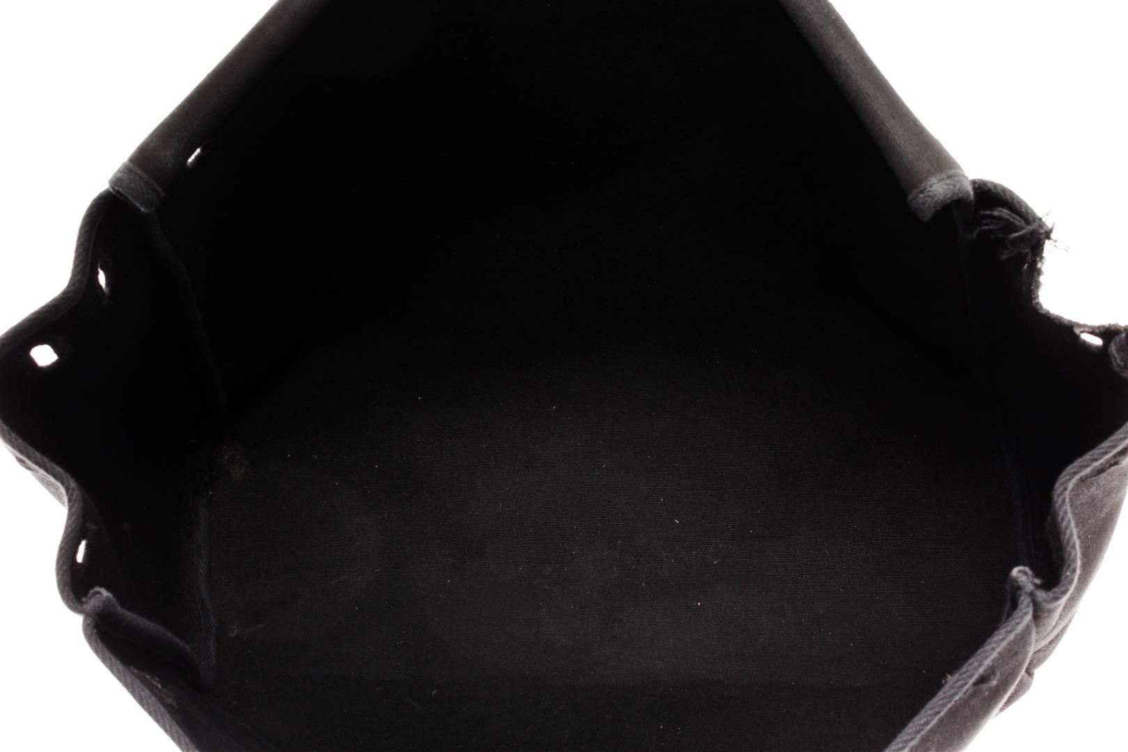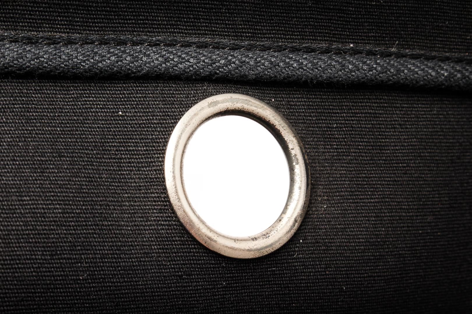 Hermes Black Canvas and Leather Insert Her Bag. All available information is listed in the description and shown in the photos. Hermes Black Canvas and Leather Insert Her Bag with vintage, noir toile officier canvas, palladium-plated hardware, flat handles & single shoulder strap leather trim embellishment, clasp closure at front, includes lock & keys.