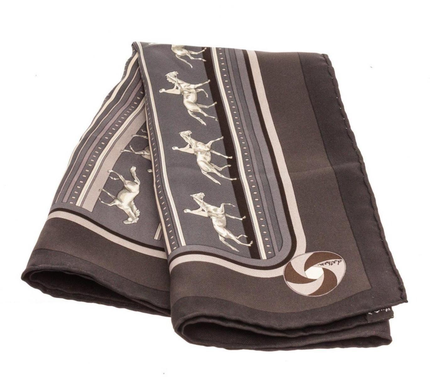 Hermes Black Gray Silk Scarf. Hermes Black Gray Silk Scarf with gold-tone hardware. MEASUREMENTS: Length 34 in / 86 cm Width 34 in / 86 cm Height 1 in / 3 cmCONDITION: Pre-Owned Good overall, please see photographs for detail.