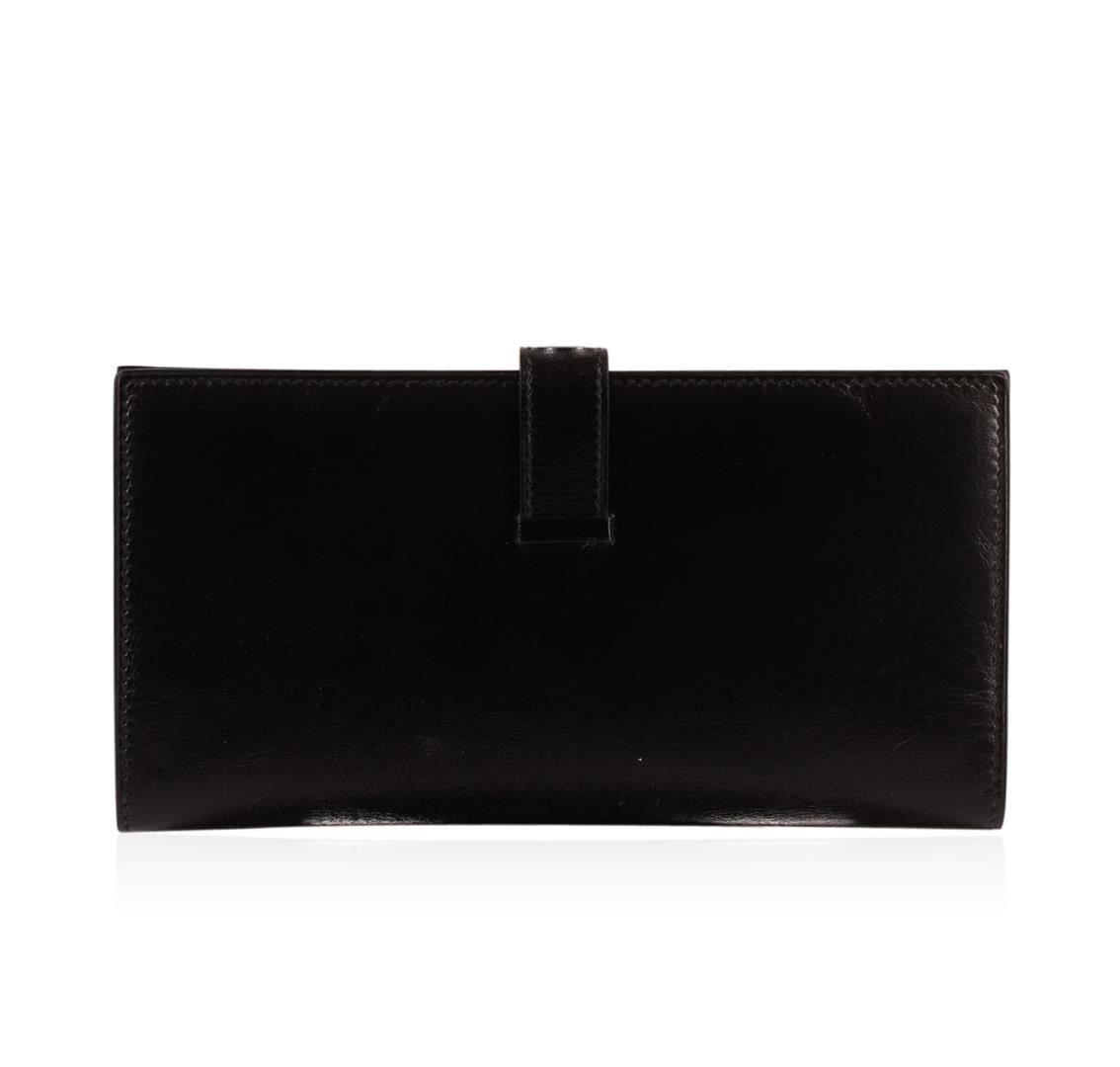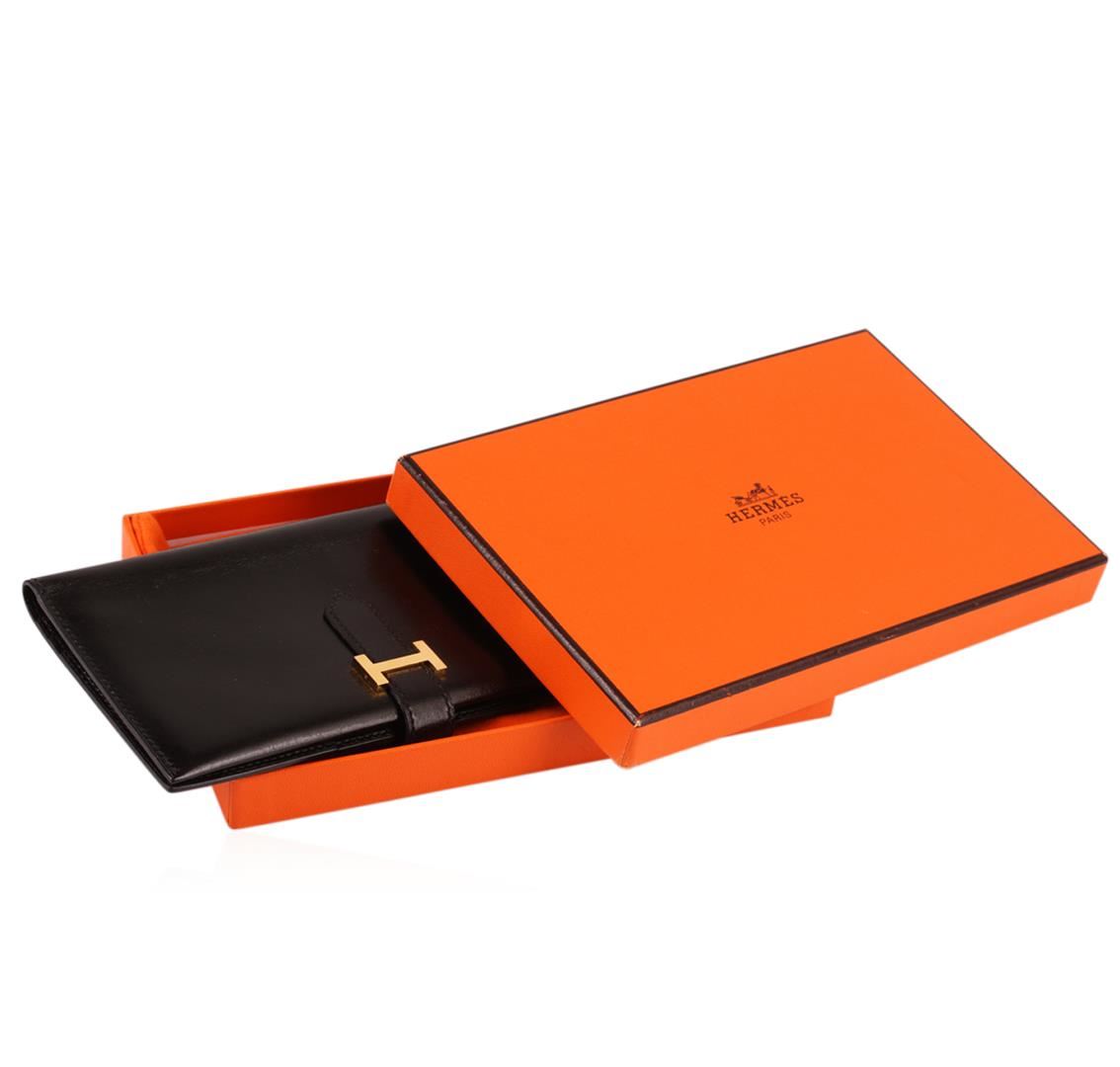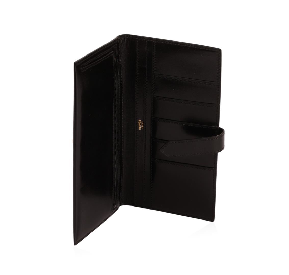 One Hermes Black Leather Ladies Wallet. Hermes leather bi-fold wallet is in excellent condition. Features: one zipper pocket and slots for both cash and credit cards. Hermes wallet comes with the original cloth bag and orange box.