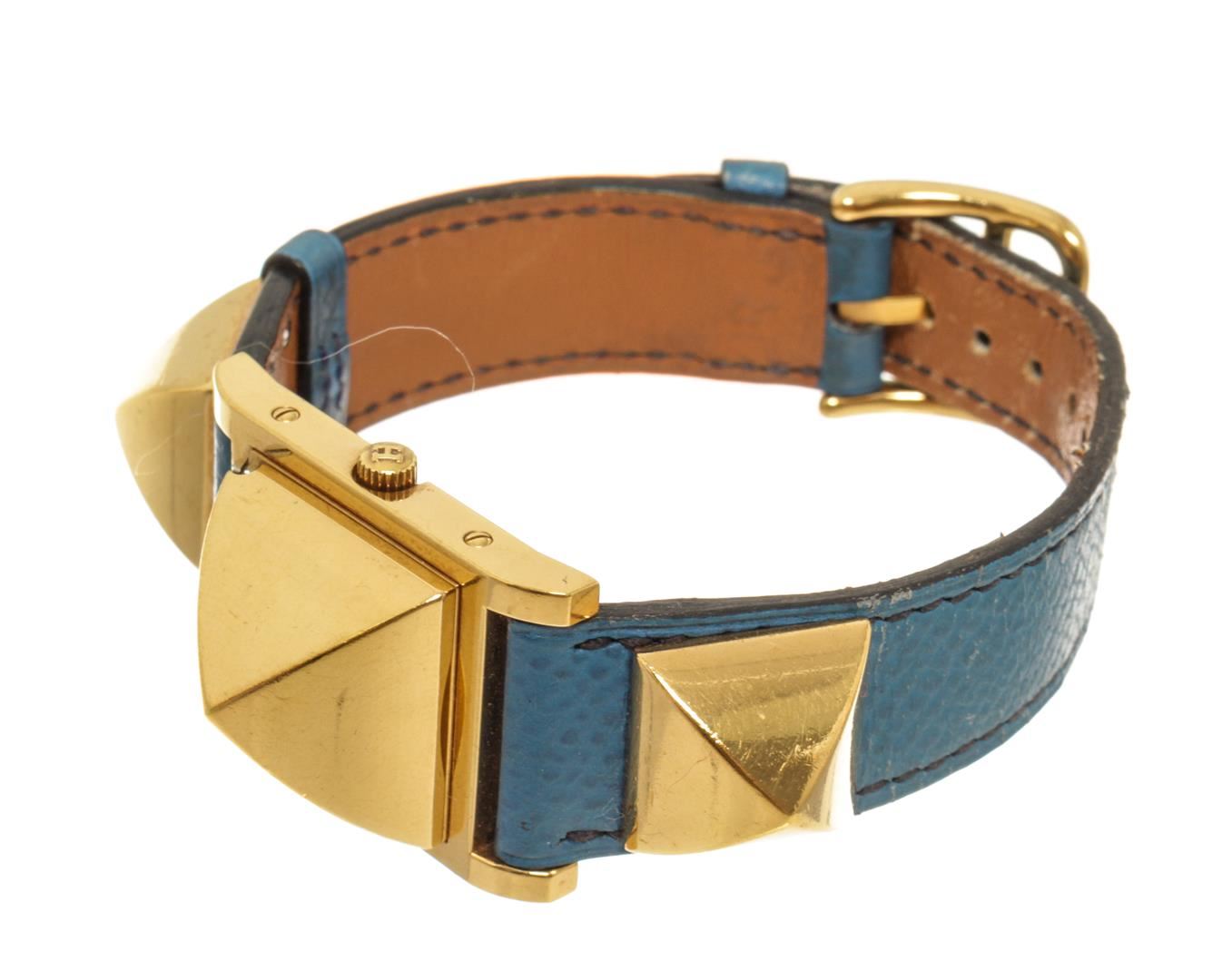 One Hermes Blue Metal and Leather Medor Plated 23 Quartz Watch. Item is sold AS-IS. All available information is listed in the description and shown in the photo. Hermes Blue Metal and Leather Medor Plated 23 Quartz Watch with "dial color white, band color blue, band material leather, case material plated 18k yellow gold, movement quartz" "Case Size/Width: 23mm Watch Height: 16mm Band Width: 18mm Wrist circumference: 6.0""" Height: 0.62" x Width: 0.70" Inches