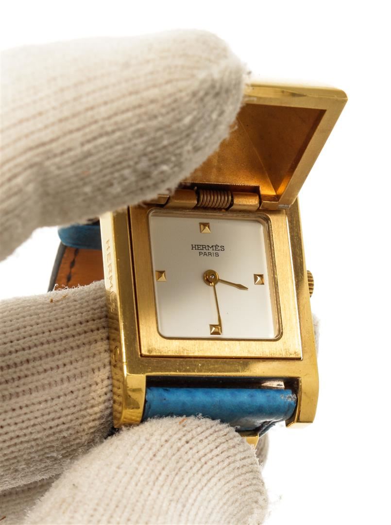 One Hermes Blue Metal and Leather Medor Plated 23 Quartz Watch. Item is sold AS-IS. All available information is listed in the description and shown in the photo. Hermes Blue Metal and Leather Medor Plated 23 Quartz Watch with "dial color white, band color blue, band material leather, case material plated 18k yellow gold, movement quartz" "Case Size/Width: 23mm Watch Height: 16mm Band Width: 18mm Wrist circumference: 6.0""" Height: 0.62" x Width: 0.70" Inches