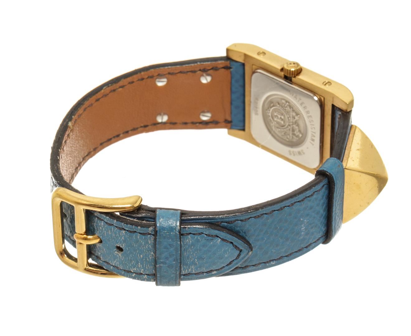 One Hermes Blue Metal and Leather Medor Plated 23 Quartz Watch. Item is sold AS-IS. All available information is listed in the description and shown in the photo. Hermes Blue Metal and Leather Medor Plated 23 Quartz Watch with "dial color white, band color blue, band material leather, case material plated 18k yellow gold, movement quartz" "Case Size/Width: 23mm Watch Height: 16mm Band Width: 18mm Wrist circumference: 6.0""" Height: 0.62" x Width: 0.70" Inches
