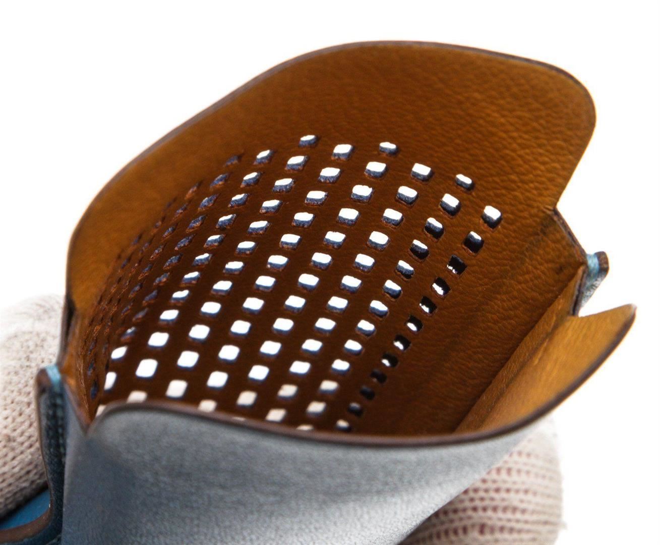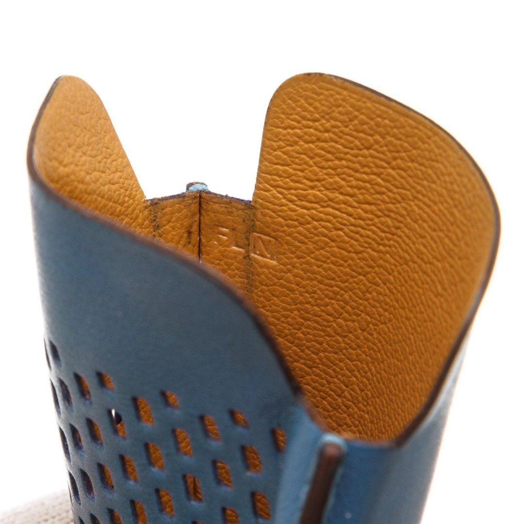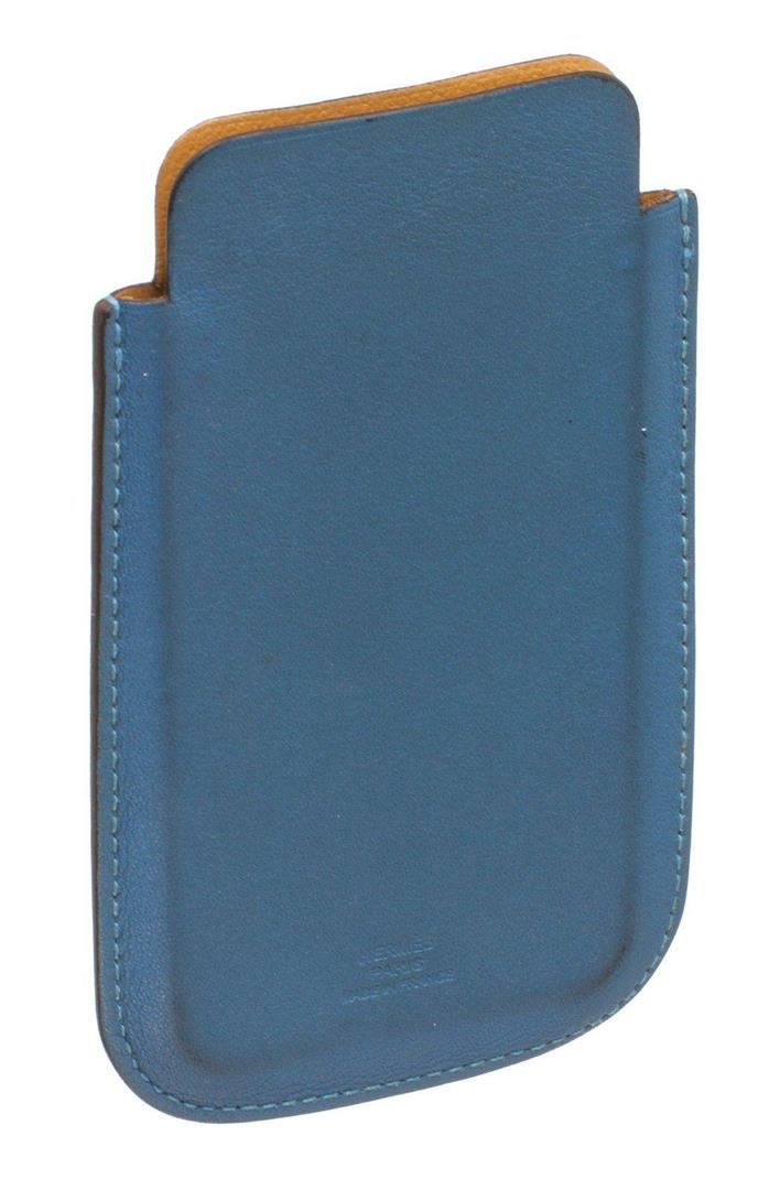 Hermes blue perforated leather iPhone 4 case with brown leather lining. Measurements: Length: 3 in / 8 cm Width: 5 in / 13 cm 1 in / 3 cm Condition: Pre-Owned Good overall, please see photographs for detail.