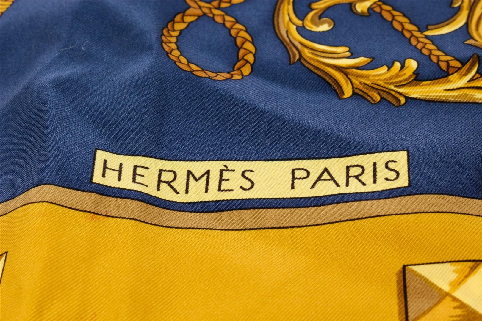 Hermes Blue and Golden Silk Les Clefs Scarf. All available information is listed in the description and shown in the photos. Hermes Blue and Golden Silk Les Clefs Scarf with gold-tone hardware, multicolour hermès 90cm silk scarf with les clèfs motif and hand-rolled edges.