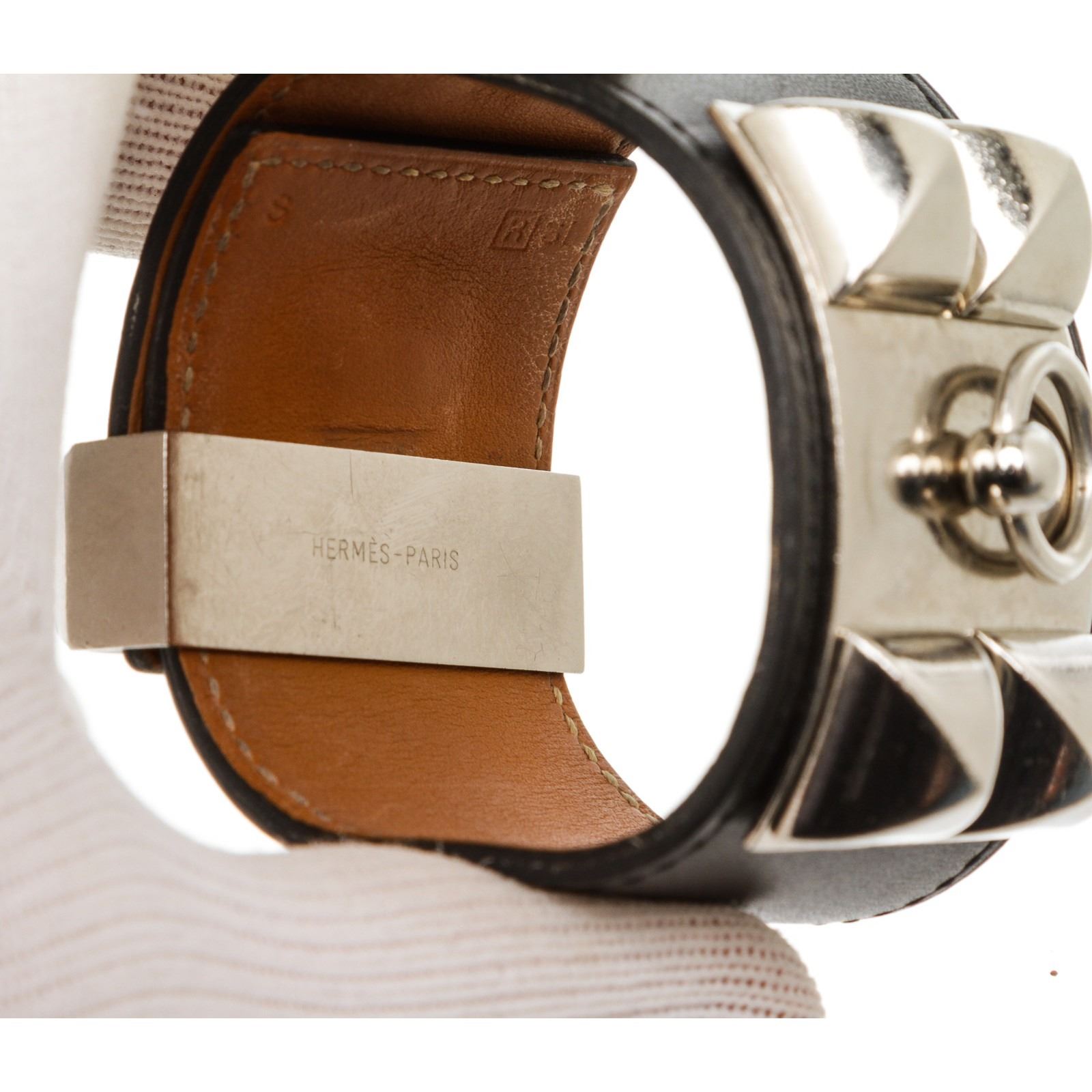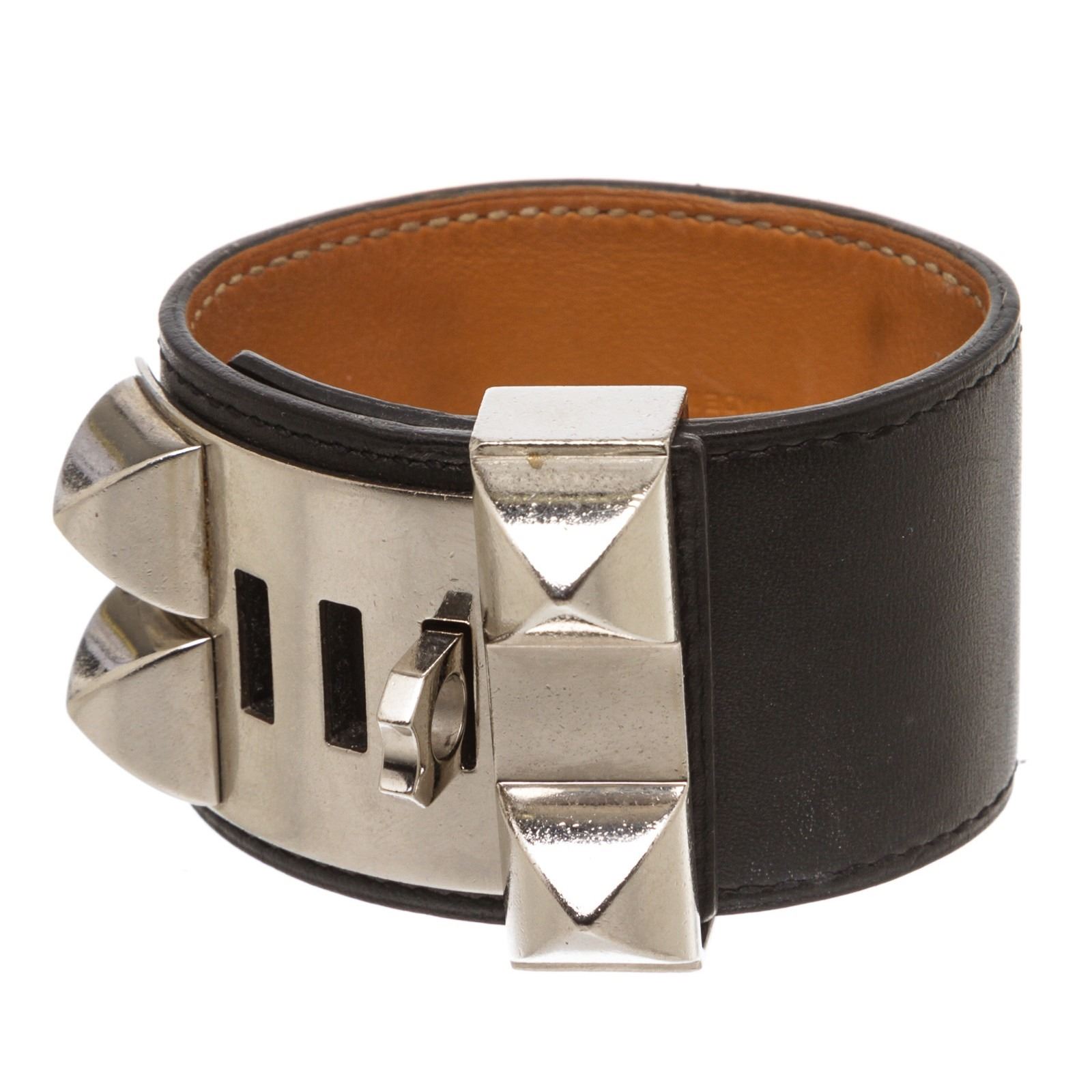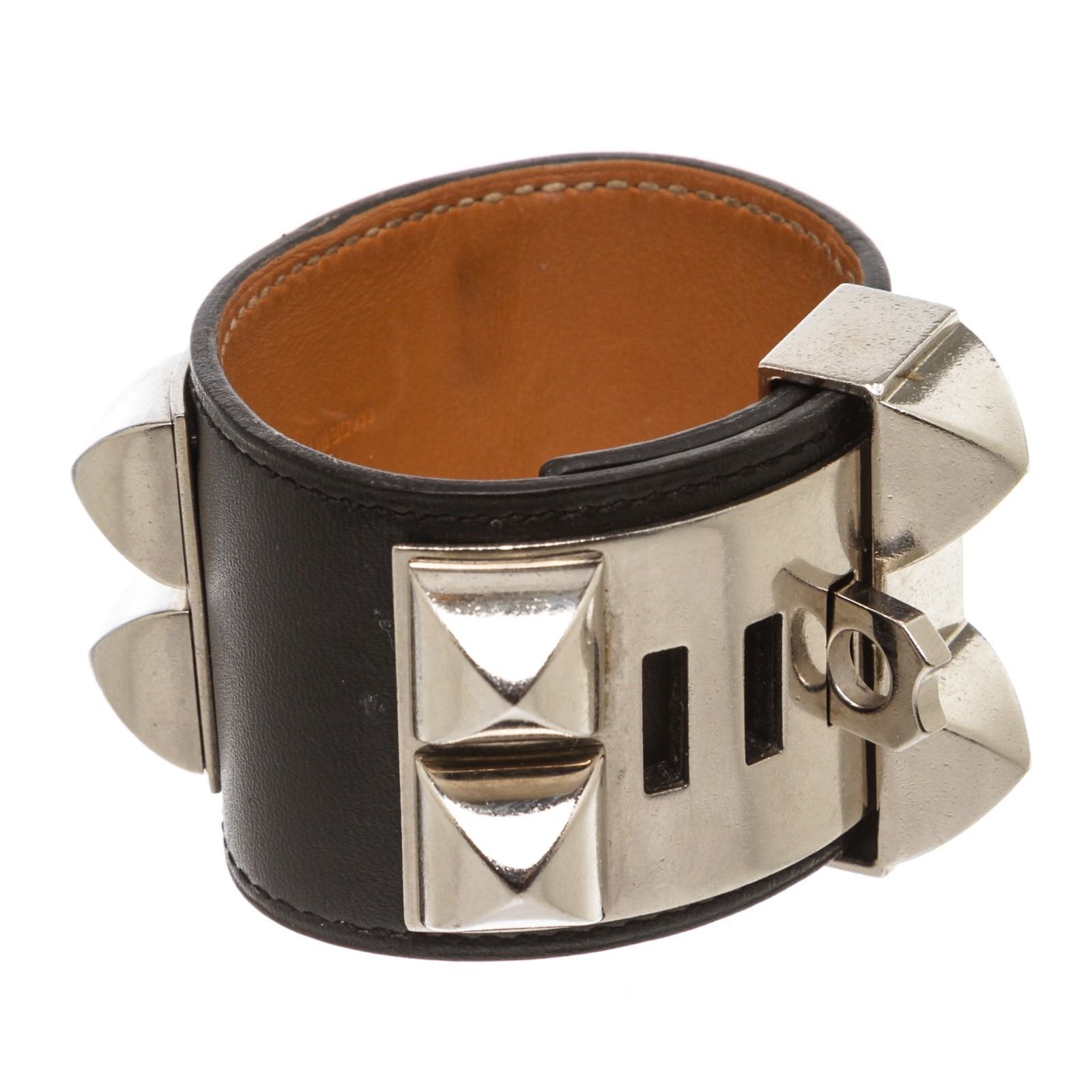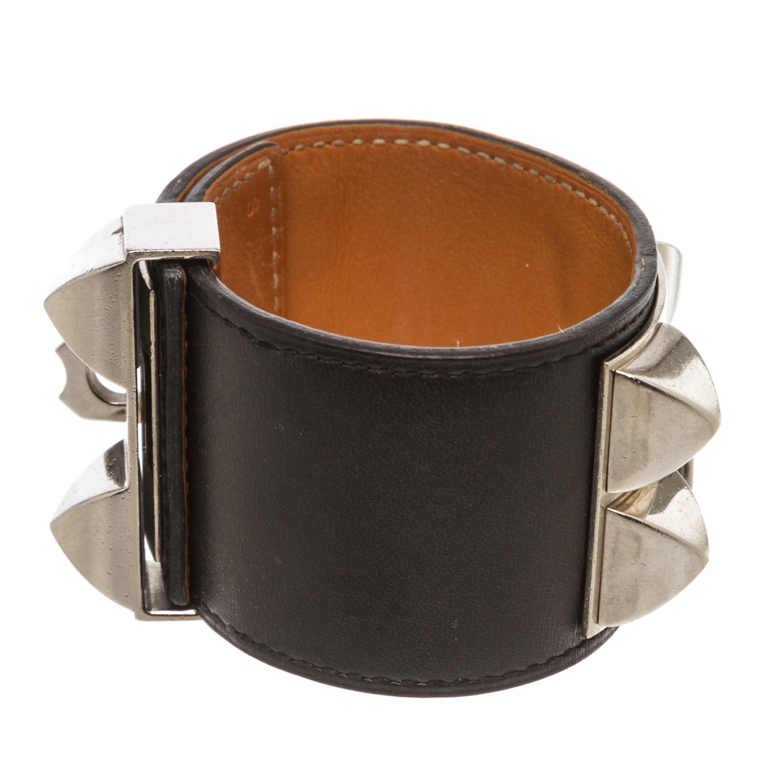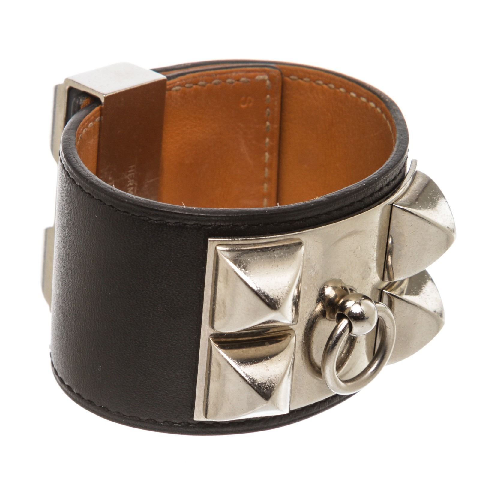 Noir leather Hermès Collier de Chien bracelet with palladium-plated hardware and adjustable slide lock and peg-in-hole closures.