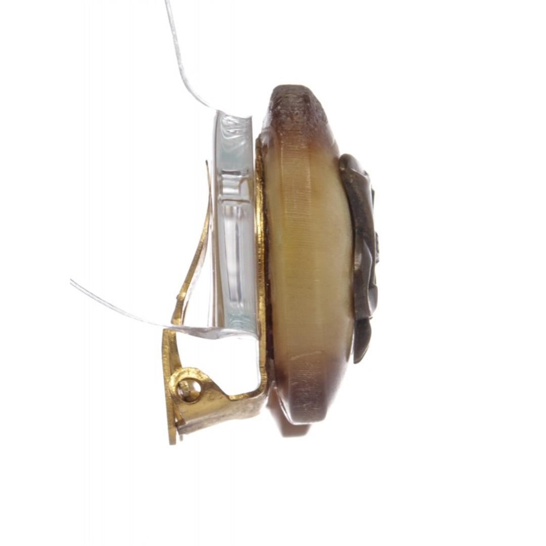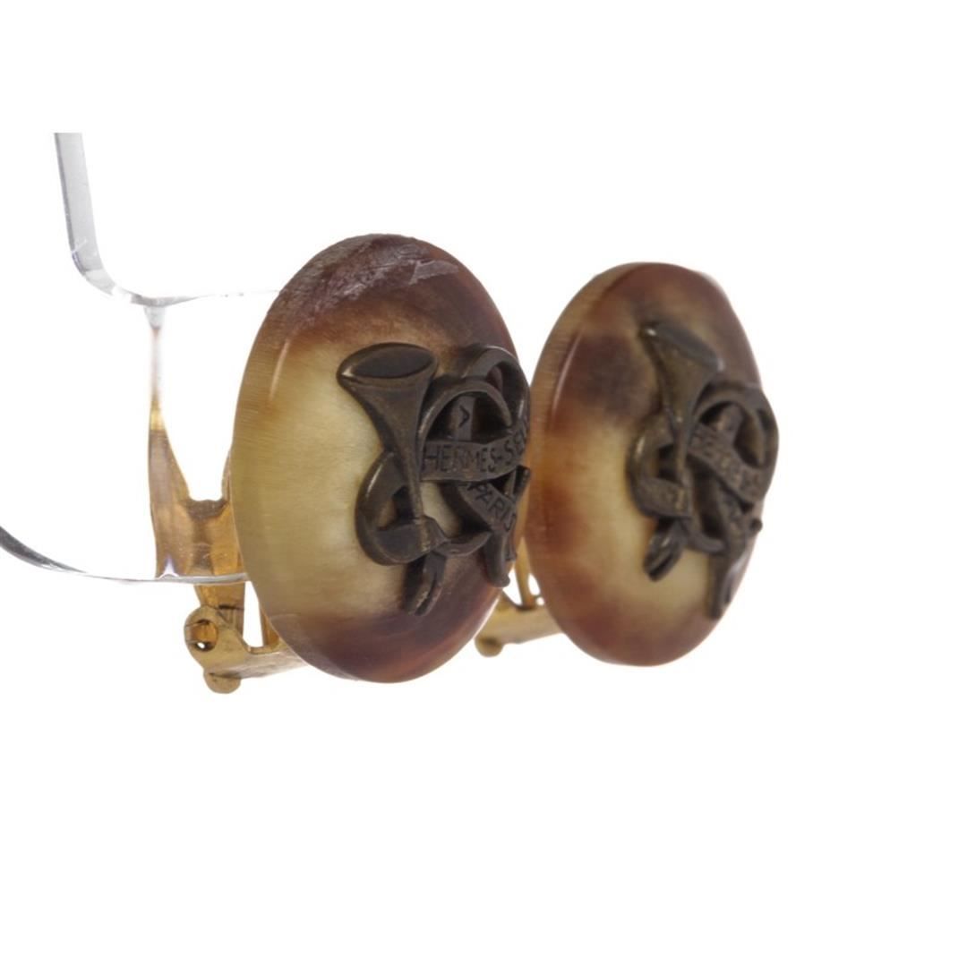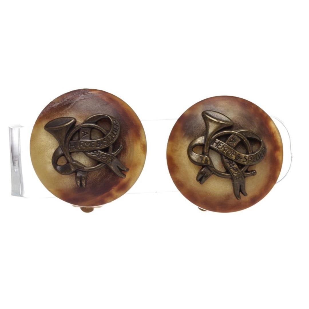 One pair of Hermes Bronze Two Tone Sellier Paris French Horn Clip On Earrings. Crafted out of brass and resin and clip on backing.