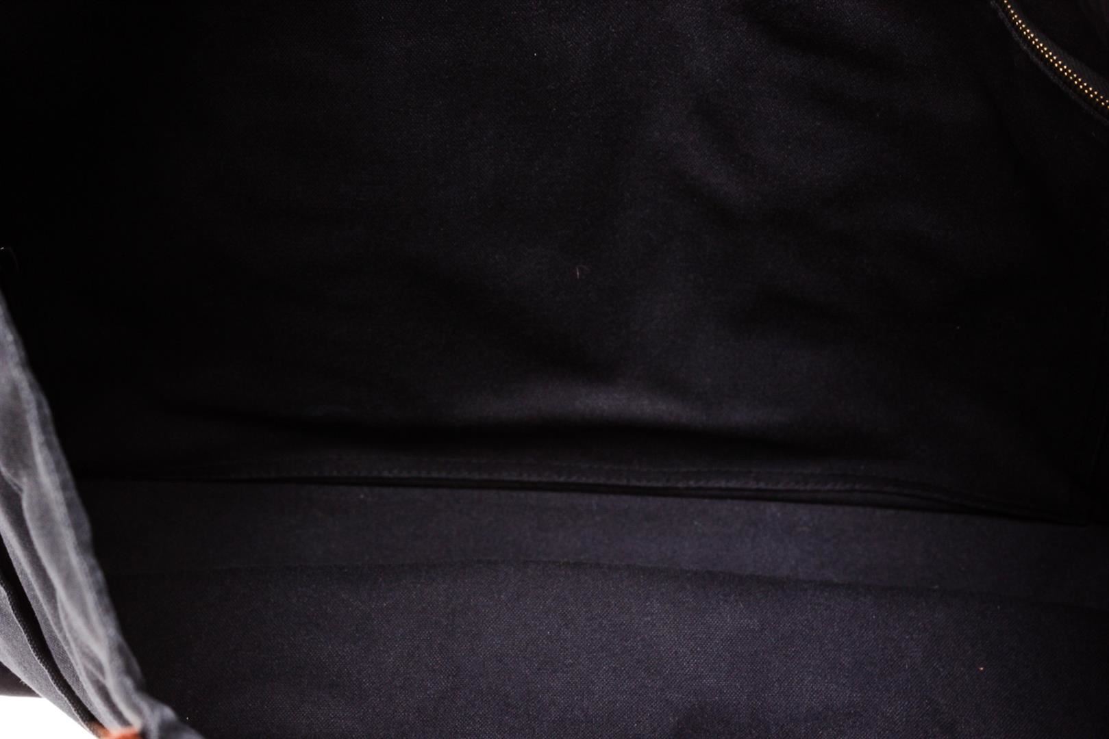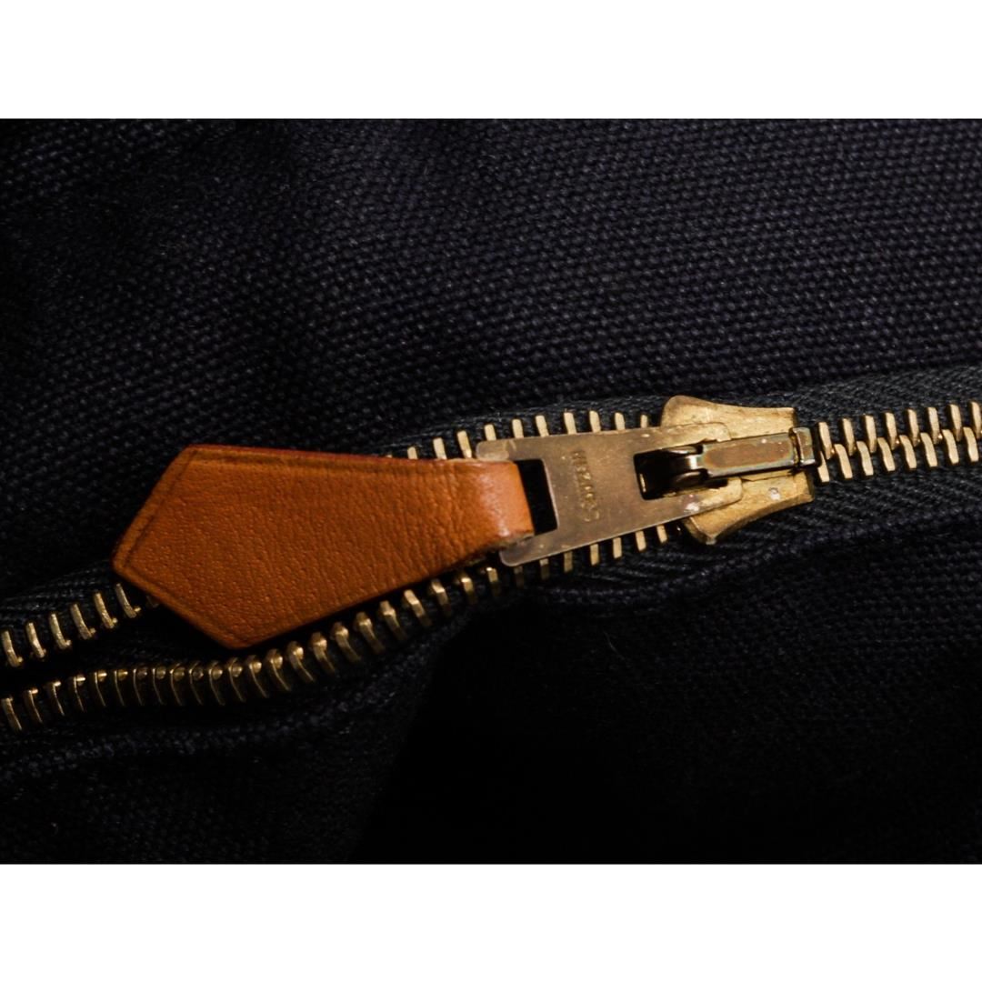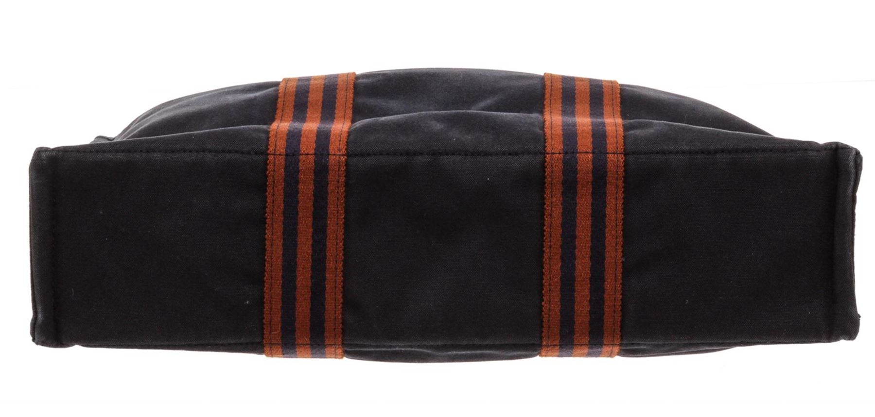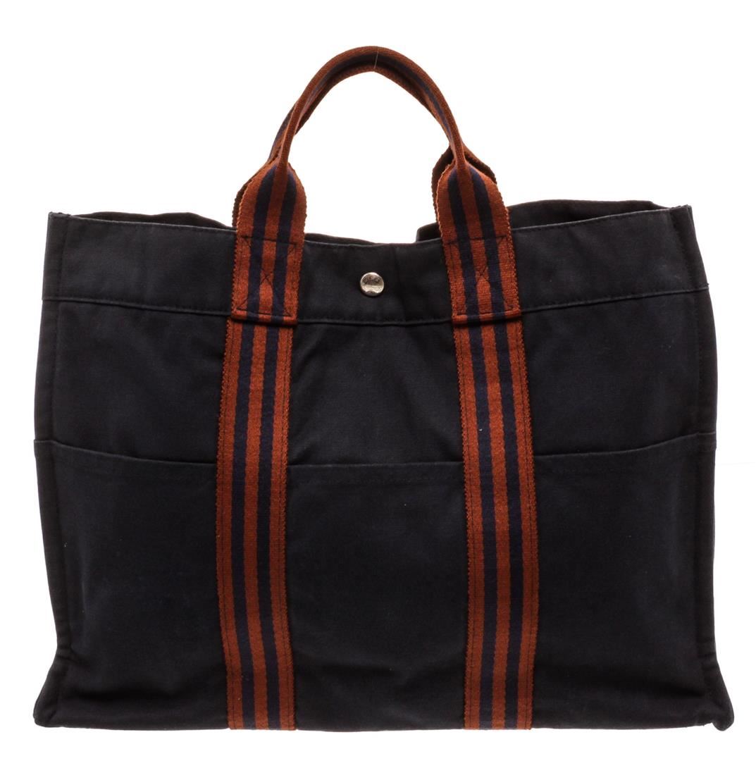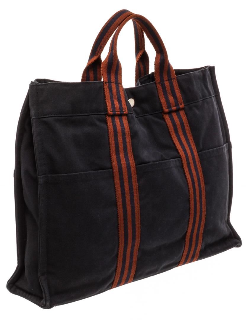 Hermes brown and navy blue canvas Sac Fourre MM tote bag with stripe canvas handles, interior zip pocket, three exterior slip pockets on front and back, side snap pocket, and snap closure. Authentic.