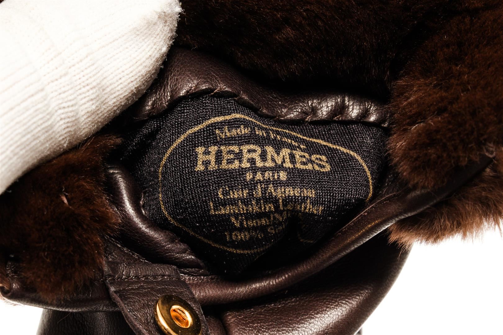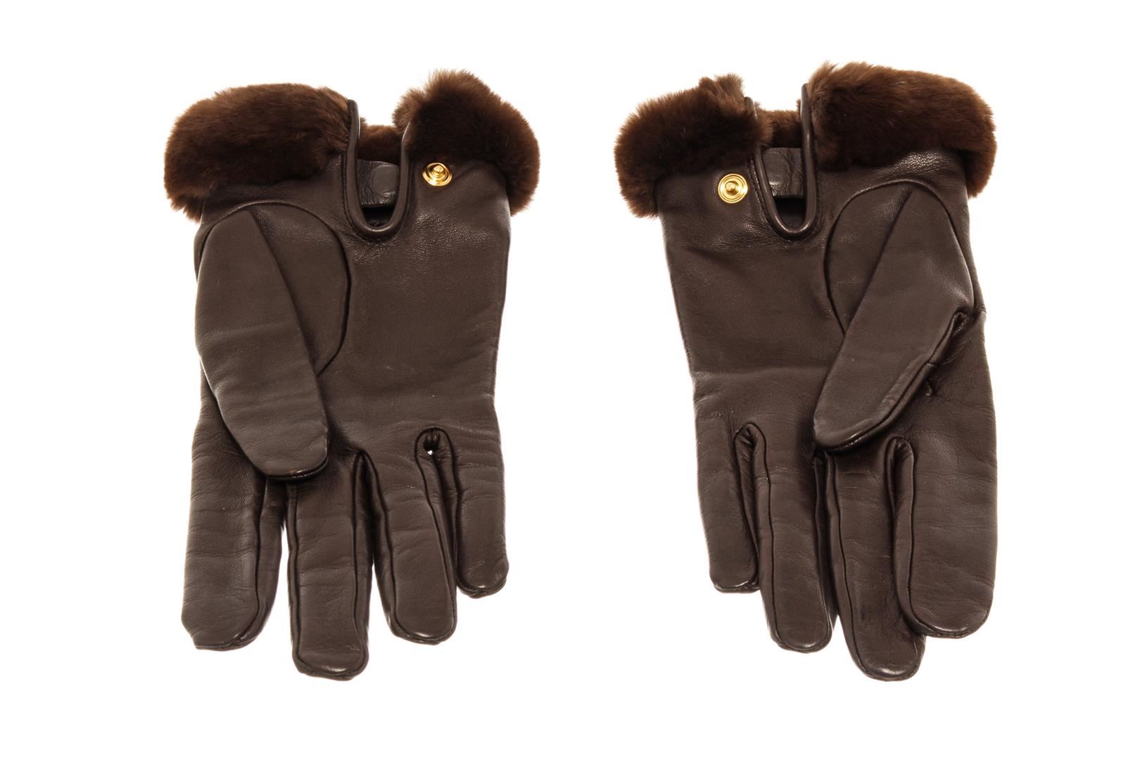 One Hermes Brown Leather Gloves. Item is sold AS-IS. All available information is listed in the description and shown in the photo. Hermes Brown Leather Gloves features Gold hardware, brown leather lining, brown mink fur along the wrists, and snap closure.